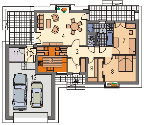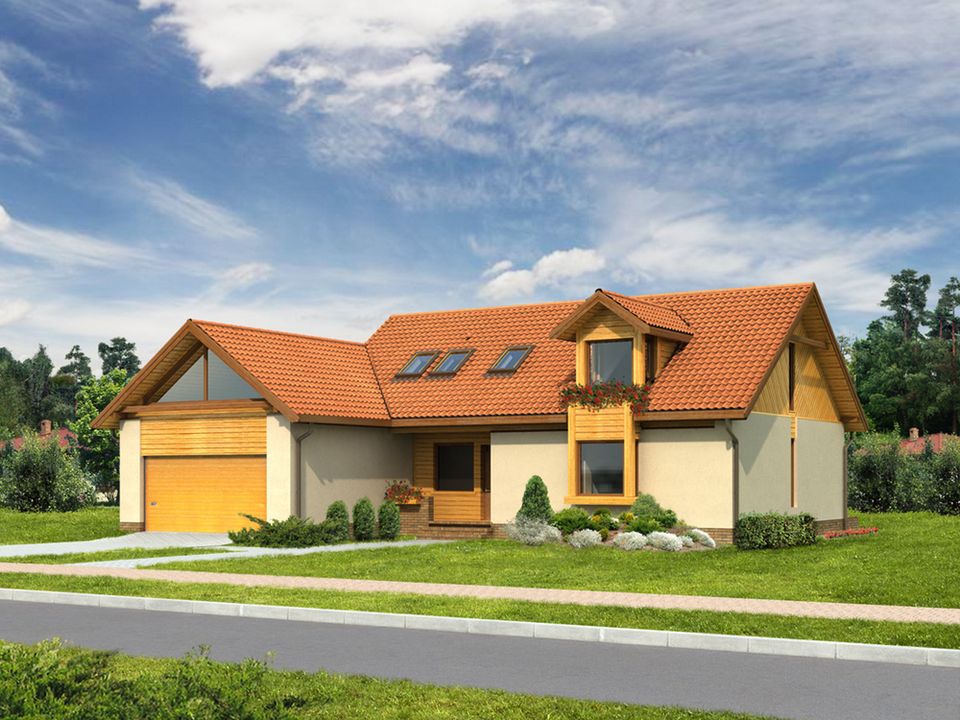 Graficzne opracowanie rzutów poglądowych widocznych na karcie projektu zostało wykonane przez Extradom.pl. Prezentowane przez Extradom.pl wizualizacje wykonane zostały przez autora projektu i należy poczytywać je jedynie za przykład i propozycję wykończenia, wizję architektoniczną autora projektu. Ostateczne wykończenie budynku może nastąpić na wiele sposobów. Szczegółowe rozwiązania zastosowane w oferowanej dokumentacji - w tym również ilość, lokalizacje i wygląd okien, drzwi, kominów - mogą w niewielkim stopniu różnić się od prezentowanej wizualizacji budynku.