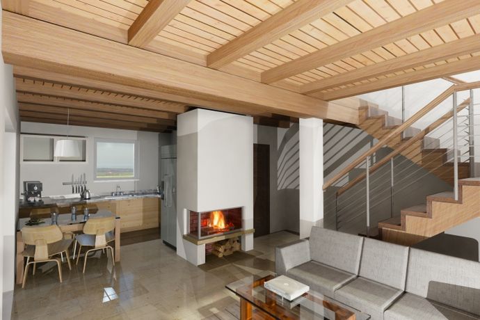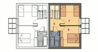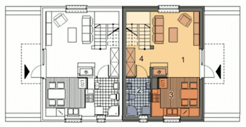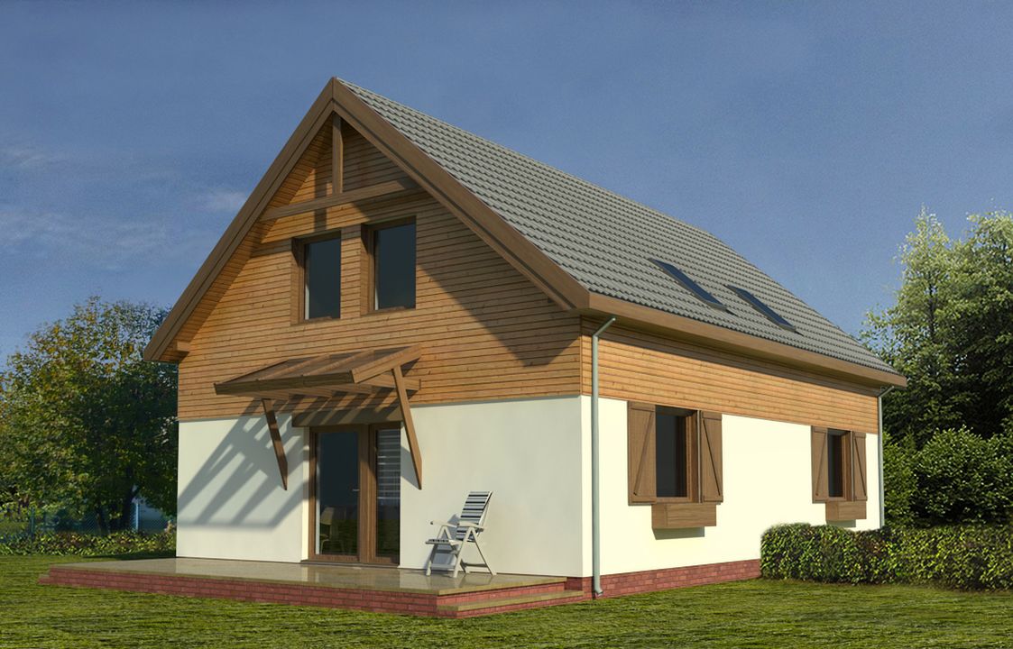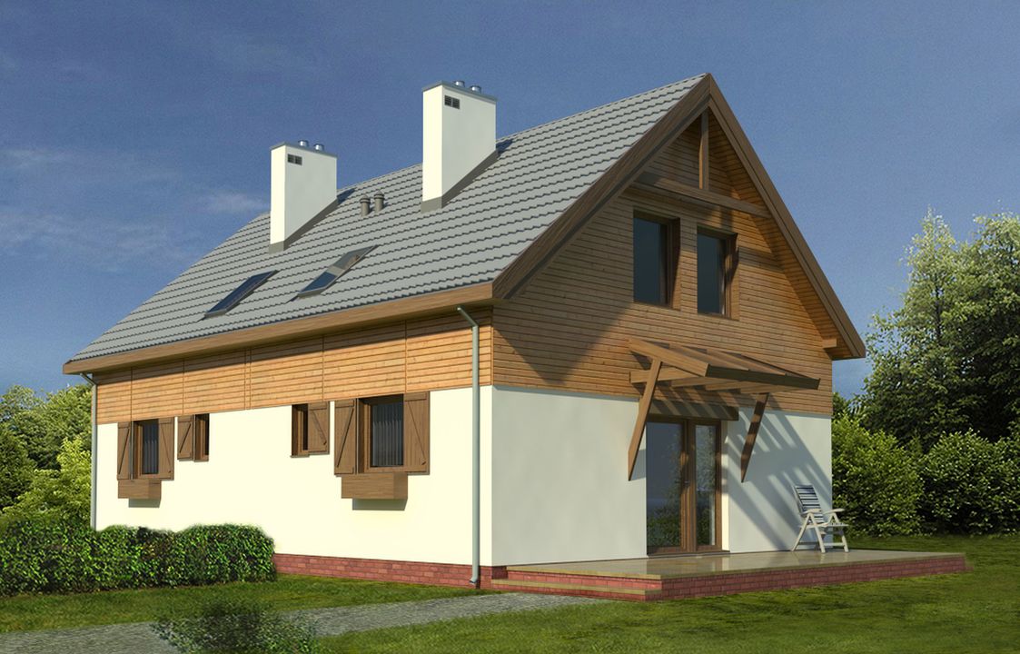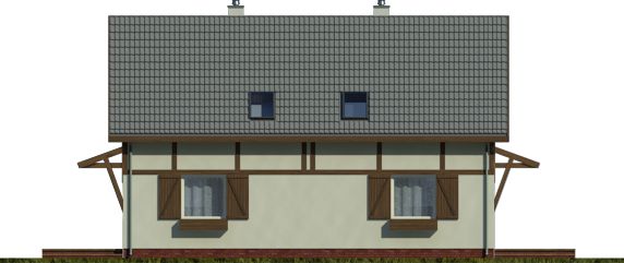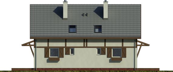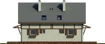 Graficzne opracowanie rzutów poglądowych widocznych na karcie projektu zostało wykonane przez Extradom.pl. Prezentowane przez Extradom.pl wizualizacje wykonane zostały przez autora projektu i należy poczytywać je jedynie za przykład i propozycję wykończenia, wizję architektoniczną autora projektu. Ostateczne wykończenie budynku może nastąpić na wiele sposobów. Szczegółowe rozwiązania zastosowane w oferowanej dokumentacji - w tym również ilość, lokalizacje i wygląd okien, drzwi, kominów - mogą w niewielkim stopniu różnić się od prezentowanej wizualizacji budynku.