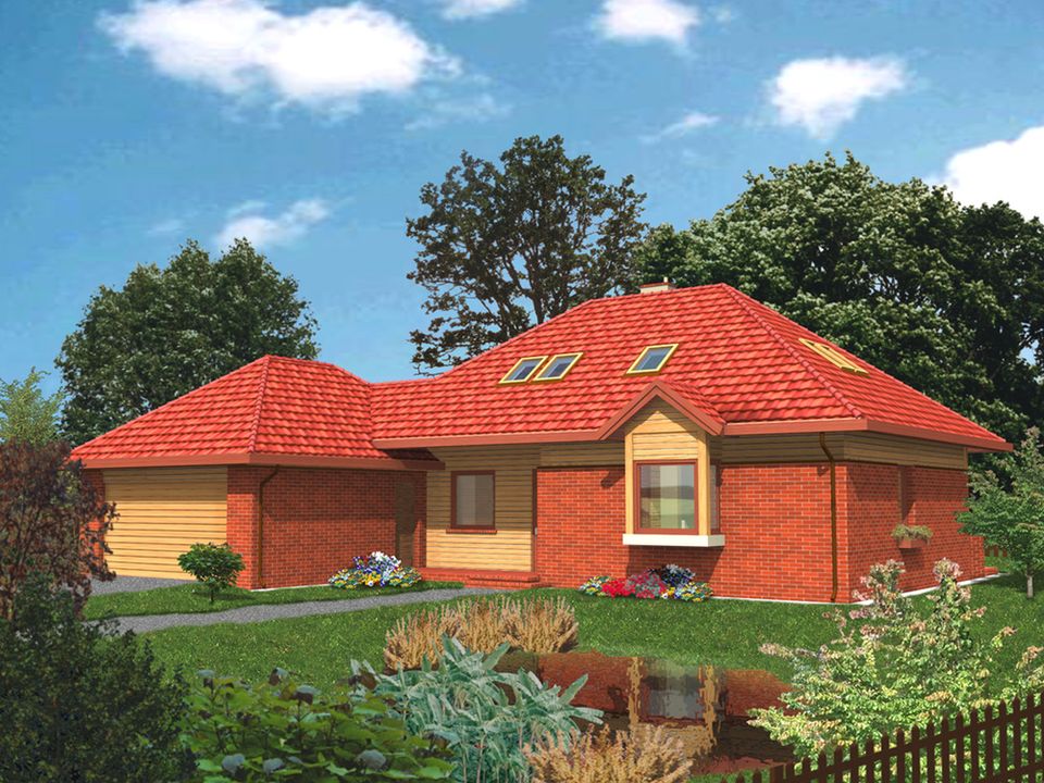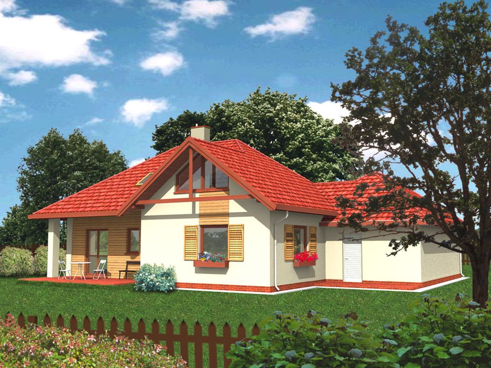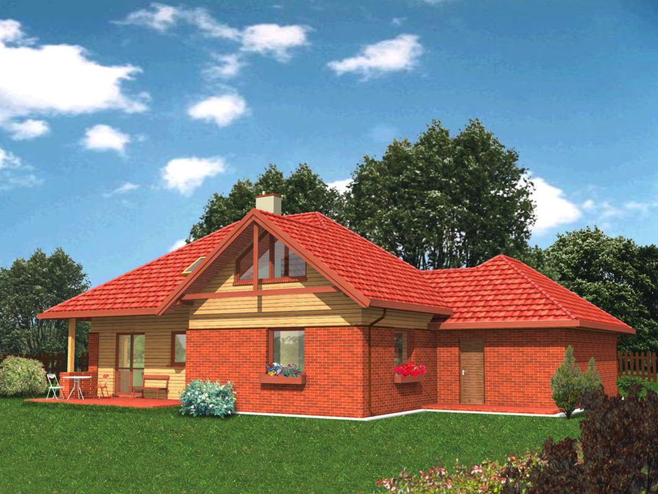 Graficzne opracowanie rzutów poglądowych widocznych na karcie projektu zostało wykonane przez Extradom.pl. Prezentowane przez Extradom.pl wizualizacje wykonane zostały przez autora projektu i należy poczytywać je jedynie za przykład i propozycję wykończenia, wizję architektoniczną autora projektu. Ostateczne wykończenie budynku może nastąpić na wiele sposobów. Szczegółowe rozwiązania zastosowane w oferowanej dokumentacji - w tym również ilość, lokalizacje i wygląd okien, drzwi, kominów - mogą w niewielkim stopniu różnić się od prezentowanej wizualizacji budynku.