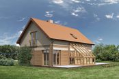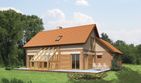 WM22a - Zygmuntówka bis jest powiększoną wersją domu „WM22”, do którego dobudowano garaż na dwa samochody, dzięki czemu na parterze uzyskano również pomieszczenie gospodarcze i garderobę. Przestrzeń parteru jest otwarta, choć istnieje możliwość jej podziału na mniejsze pomieszczenia i dowolnej aranżacji wnętrza. Kominek i schody prowadzące na poddasze, znajdujące się w centrum domu, optycznie i funkcjonalnie wyodrębniają kuchnię z jadalnią od strefy wypoczynkowej. Kominek i komin zasłaniają część parteru przed wzrokiem niespo-dziewanego gościa i przysłaniają drzwi do łazienki. Oranżeria, zaprojektowana na osi wejścia w sposób naturalny otwiera dom na ogród i nawet w zimie daje szansę obcowania z przyrodą. Na piętrze przewidziano trzy sypialnie (jedną dużą z garderobą i dwie mniejsze) oraz łazienkę. Technologia i materiały: Projekt w wersji podstawowej ma elewację wykończoną tynkiem mineralnym, cokół oblicowany płytkami klinkierowymi oraz fragmenty ścian obłożone deskami. Dach pokryty jest dachówką ceramiczną, a okapy podbite deskami. Ściany są murowane z bloczków ceramicznych i betonowych i ocieplone płytami styropianu lub wełny mineralnej. Nad parterem zaprojektowano strop żelbetowy gęsto żebrowy wykonany z gotowych elementów belek i pustaków stropowych. Konstrukcja dachu jest krokwiowo-jętkowa z belkami, słupami i płatwiami z drewna sosnowego. Do budowy domu przewiduje się zastosowanie powszechnie dostępnych materiałów budowlanych. Oranżeria może być wybudowana od razu, bądź po kilku latach. Uniwersalny wygląd domu, wzorowany na rdzennym Polskim budownictwie sprawia, że dom będzie się dobrze prezentował w dowolnym krajobrazie - miejskim, podmiejskim czy w przestrzeni otwartej.