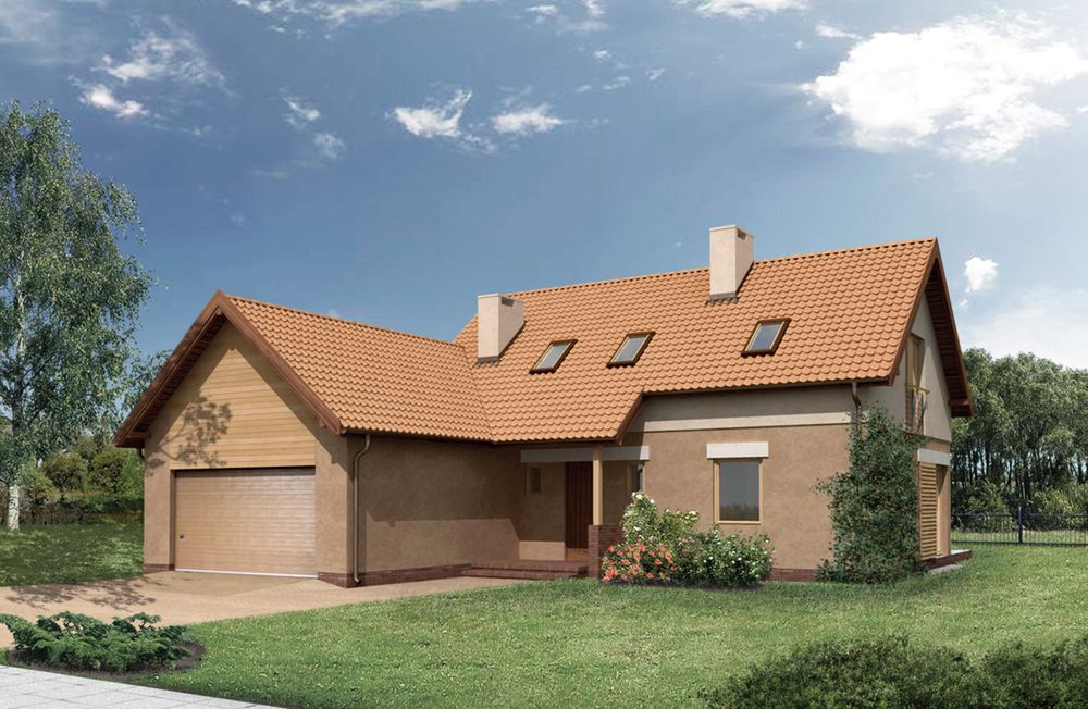 Graficzne opracowanie rzutów poglądowych widocznych na karcie projektu zostało wykonane przez Extradom.pl. Prezentowane przez Extradom.pl wizualizacje wykonane zostały przez autora projektu i należy poczytywać je jedynie za przykład i propozycję wykończenia, wizję architektoniczną autora projektu. Ostateczne wykończenie budynku może nastąpić na wiele sposobów. Szczegółowe rozwiązania zastosowane w oferowanej dokumentacji - w tym również ilość, lokalizacje i wygląd okien, drzwi, kominów - mogą w niewielkim stopniu różnić się od prezentowanej wizualizacji budynku.