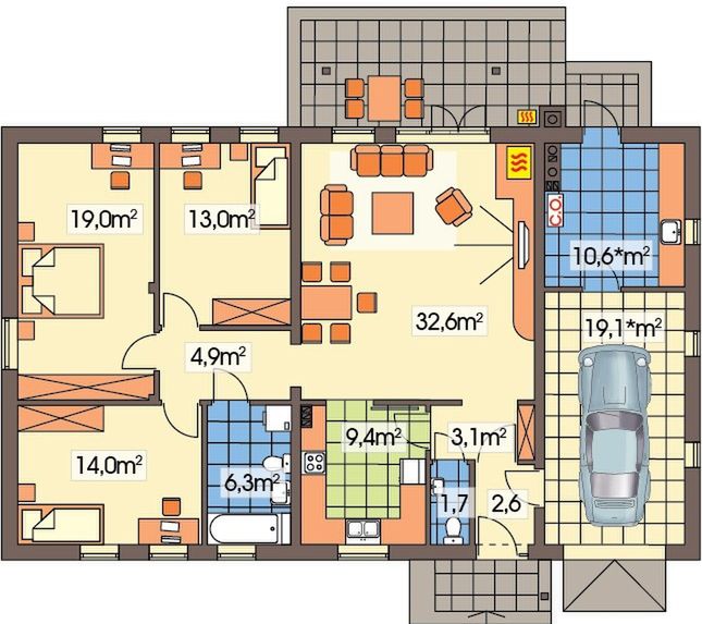 Projekt domu Wojtek 2 wersja B z pojedynczym gar. paliwo stałe jest doskonałym rozwiązaniem dla osób posiadających średniej szerokości działkę. Dom charakteryzuje się typową bryłą, więc będzie się dobrze prezentował niezależnie od otoczenia. W tym projekcie kalenica usytuowana jest równolegle do drogi, co jest bardzo istotnie, gdy wymaga tego plan zagospodarowania przestrzennego. Projekt został stworzony z myślą o działkach pozwalających na usytuowanie domu w zabudowie wolnostojącej. Autor projektu uwzględnił garaż jednostanowiskowy w bryle budynku. Bryła budynku przykryta jest dachem dwuspadowym, co pozwala na ograniczenie kosztów. Projekt Wojtek 2 wersja B z pojedynczym gar. paliwo stałe to dom parterowy, co jest szczególnie bezpieczne w przypadku domowników w starszym wieku oraz osób niepełnosprawnych czy z małymi dziećmi. Sercem domu jest przestronna strefa dzienna, która sprzyja spędzaniu wspólnego czasu w gronie najbliższych. Dzięki zamkniętej kuchni, unikniemy ciekawskich spojrzeń gości, co szczególnie sprawdzi się podczas przyjęć, w trakcie których nie zawsze mamy w niej idealny porządek. Połączenie jadalni z salonem sprzyja integracji rodziny. Podczas odpoczynku, rodzice mogą zerkać na bawiące się lub odrabiające lekcje dzieci.Dodatkowo w salonie przewidziano kominek, nadający wnętrzu niepowtarzalny klimat. W domu została uwzględniona wygodna łazienka oraz osobna ubikacja, co jest szczególnie przydatne przy większej liczbie domowników. Potrzeby 2-4 osobowej rodziny spełnią przewidziane w projekcie trzy przestronne sypialnie. Przestrzeń można wykorzystać także jako pokój dla gości lub gabinet. W projekcie nie mogło również zabraknąć miejsca na wyjątkowo przydatne pomieszczenie gospodarcze. Rodzinne spotkania w słonecznie dni uprzyjemni przewidziany przy domu taras. Projekt powstał z myślą o Inwestorach, którzy planują zbudować dom w technologii murowanej. Jego wygląd zewnętrzny uwydatnia cechy charakterystyczne dla stylu tradycyjnego, dzięki czemu idealnie wpisze się w dowolny krajobraz.