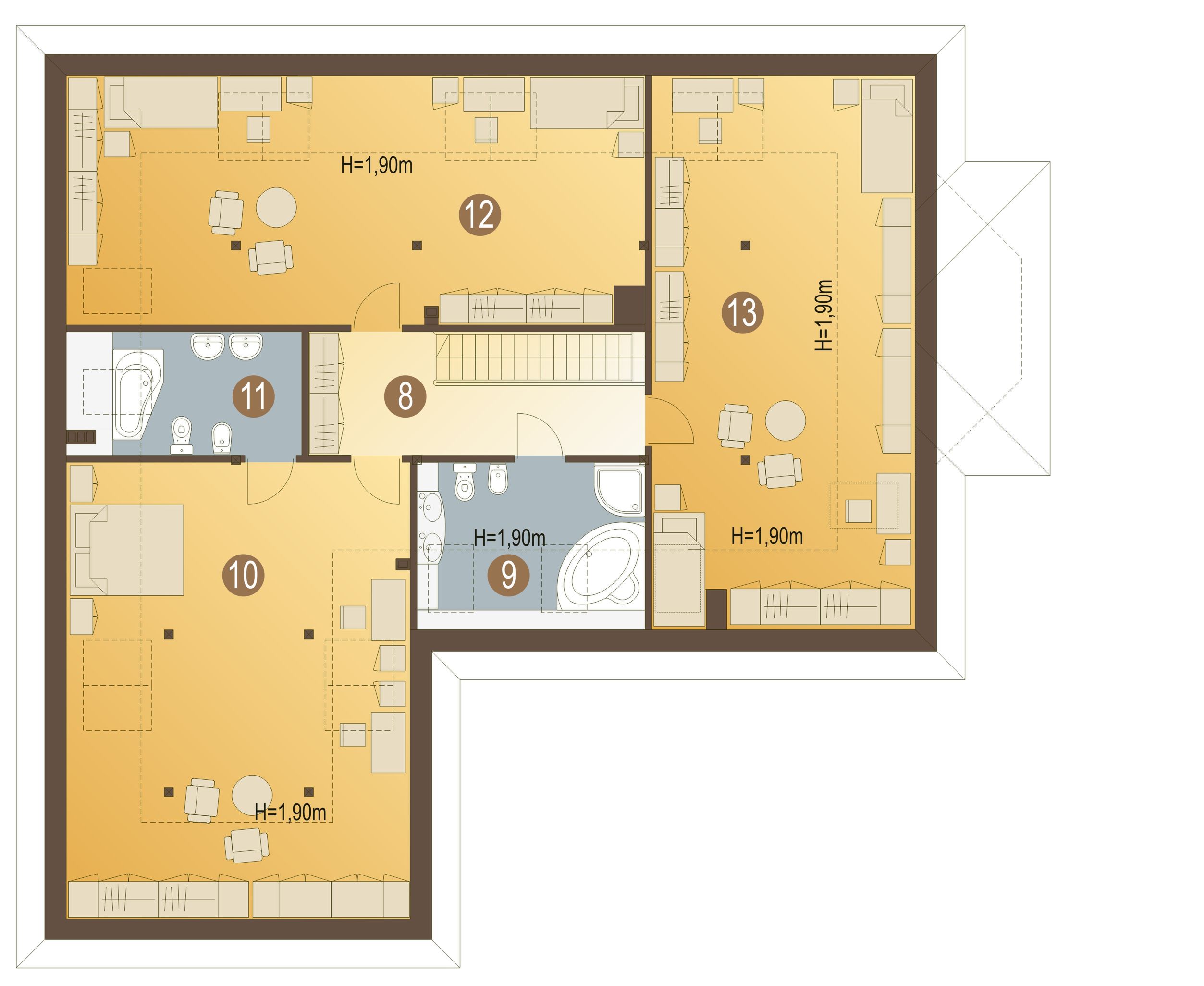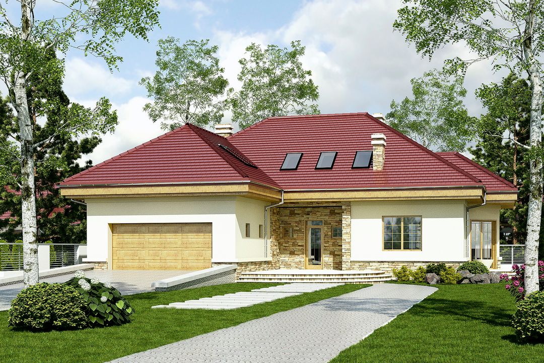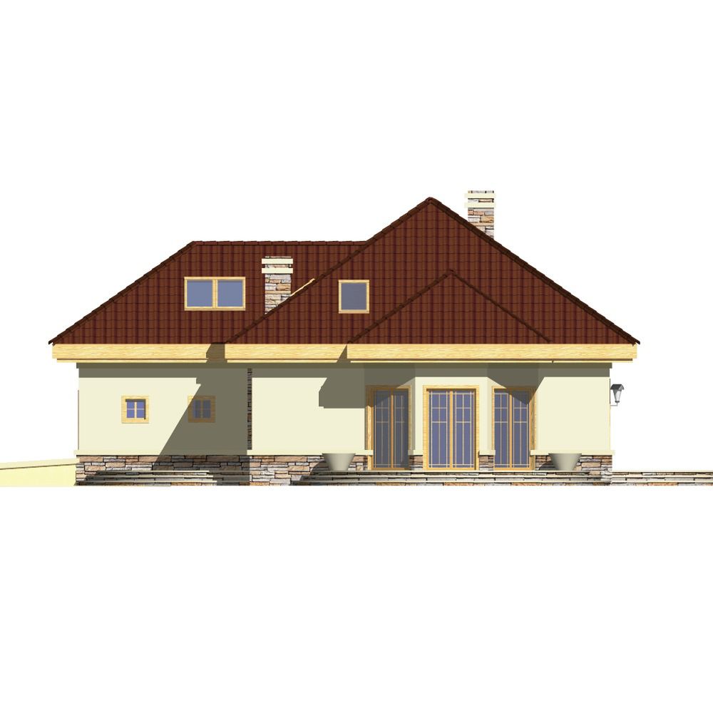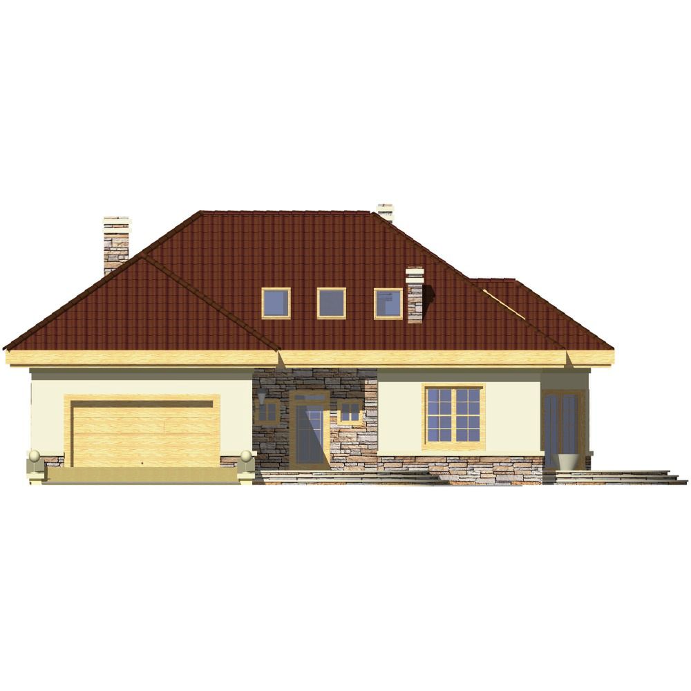 Graficzne opracowanie rzutów poglądowych widocznych na karcie projektu zostało wykonane przez Extradom.pl. Prezentowane przez Extradom.pl wizualizacje wykonane zostały przez autora projektu i należy poczytywać je jedynie za przykład i propozycję wykończenia, wizję architektoniczną autora projektu. Ostateczne wykończenie budynku może nastąpić na wiele sposobów. Szczegółowe rozwiązania zastosowane w oferowanej dokumentacji - w tym również ilość, lokalizacje i wygląd okien, drzwi, kominów - mogą w niewielkim stopniu różnić się od prezentowanej wizualizacji budynku.