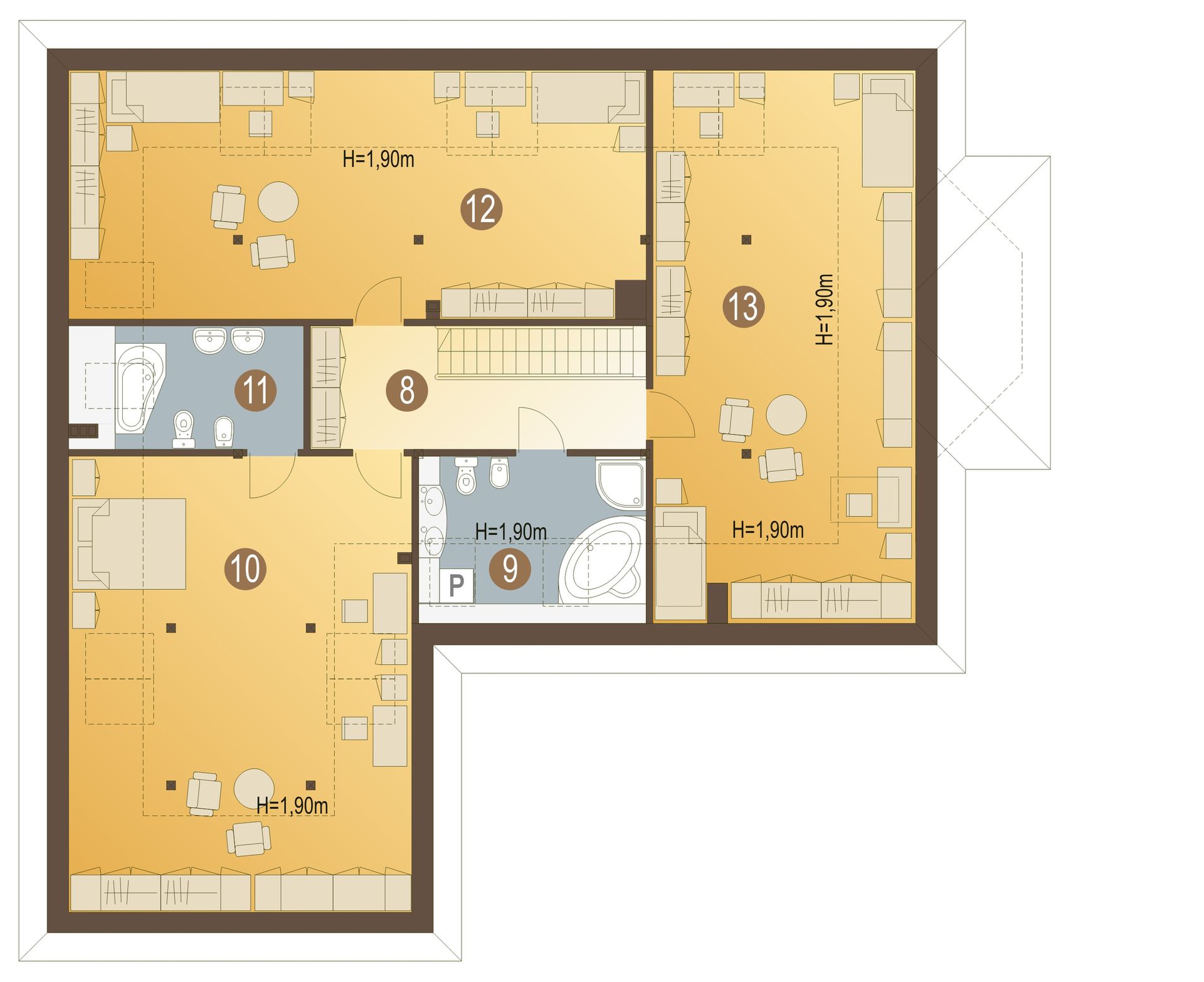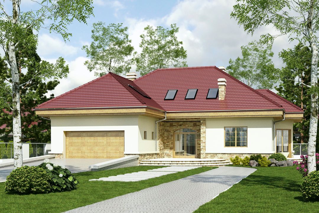 Graficzne opracowanie rzutów poglądowych widocznych na karcie projektu zostało wykonane przez Extradom.pl. Prezentowane przez Extradom.pl wizualizacje wykonane zostały przez autora projektu i należy poczytywać je jedynie za przykład i propozycję wykończenia, wizję architektoniczną autora projektu. Ostateczne wykończenie budynku może nastąpić na wiele sposobów. Szczegółowe rozwiązania zastosowane w oferowanej dokumentacji - w tym również ilość, lokalizacje i wygląd okien, drzwi, kominów - mogą w niewielkim stopniu różnić się od prezentowanej wizualizacji budynku.