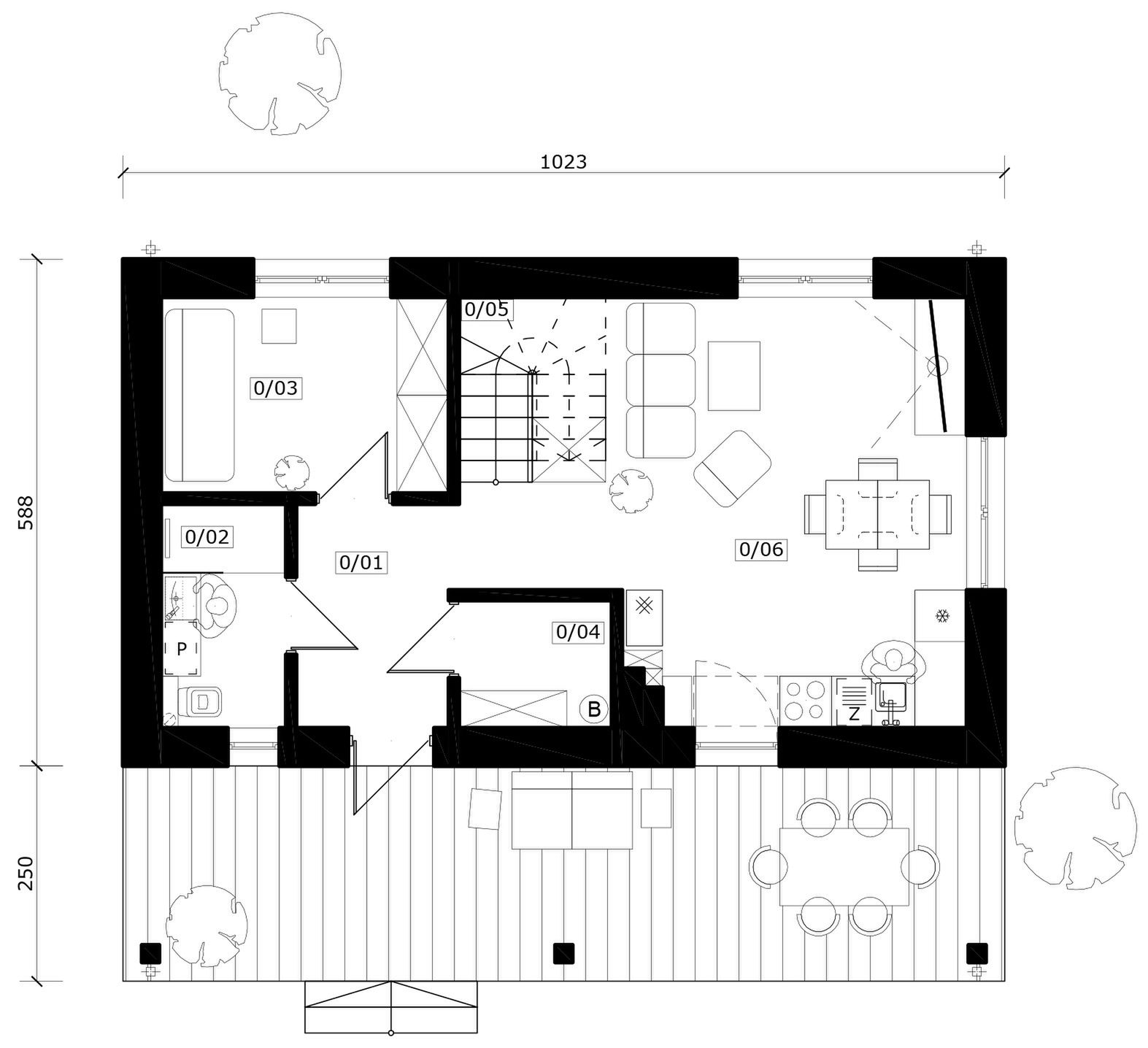 Posadowienie budynku: ława fundamentowa; Ściany zewnętrzne: pustak 24+ocieplenie 20cm; Ściany wewnętrzne: pustak 12cm; Strop nad parterem: żelbetowy; Konstrukcja dachu: Krewniana krokwiowa; Pokrycie dachu: blacha; Elewacja: tynk; deska; Wentylacja: grawitacyjna; Ogrzewanie podstawowe: paliwo stałe+elektryczne;