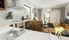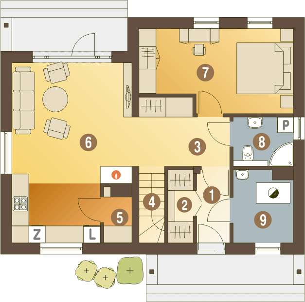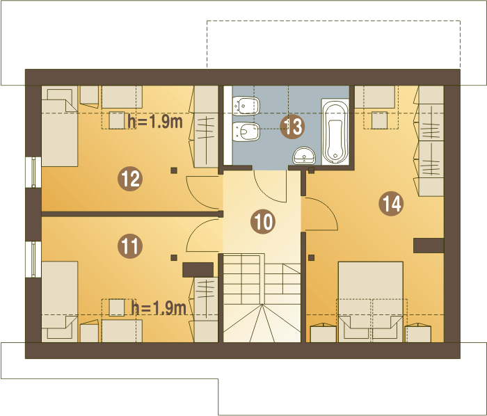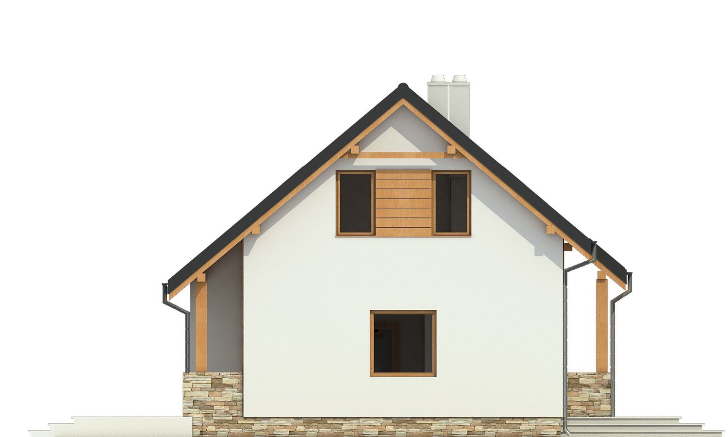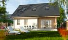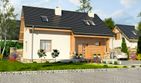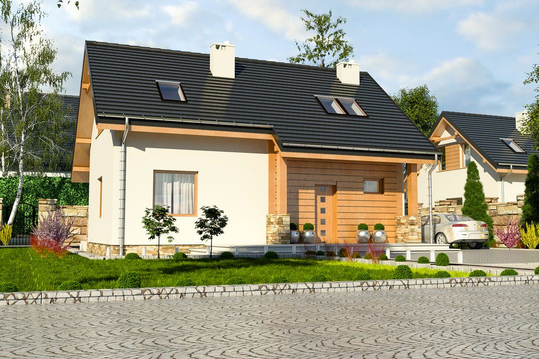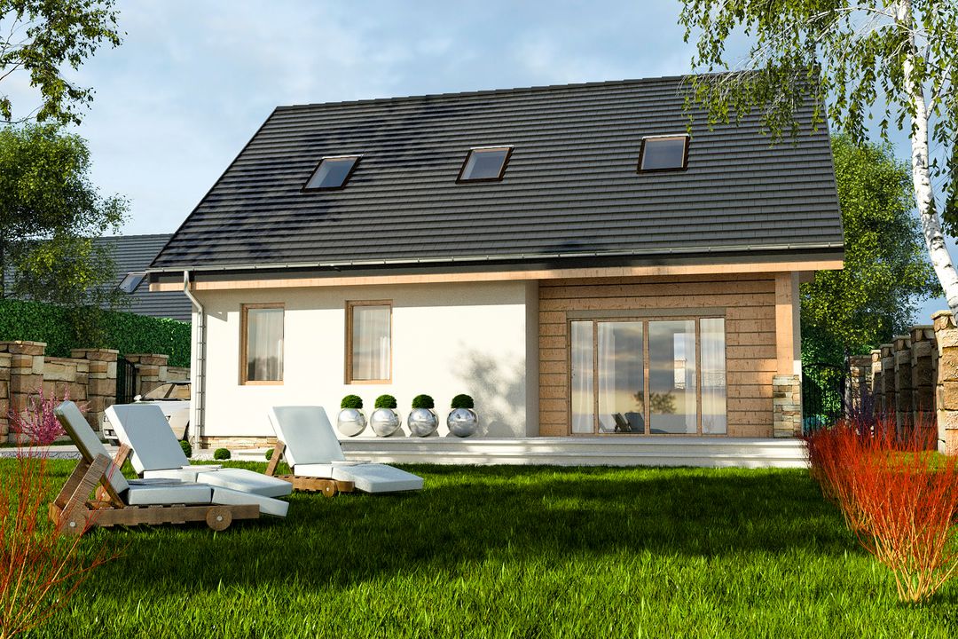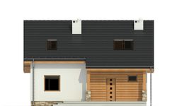 Graficzne opracowanie rzutów poglądowych widocznych na karcie projektu zostało wykonane przez Extradom.pl. Prezentowane przez Extradom.pl wizualizacje wykonane zostały przez autora projektu i należy poczytywać je jedynie za przykład i propozycję wykończenia, wizję architektoniczną autora projektu. Ostateczne wykończenie budynku może nastąpić na wiele sposobów. Szczegółowe rozwiązania zastosowane w oferowanej dokumentacji - w tym również ilość, lokalizacje i wygląd okien, drzwi, kominów - mogą w niewielkim stopniu różnić się od prezentowanej wizualizacji budynku.