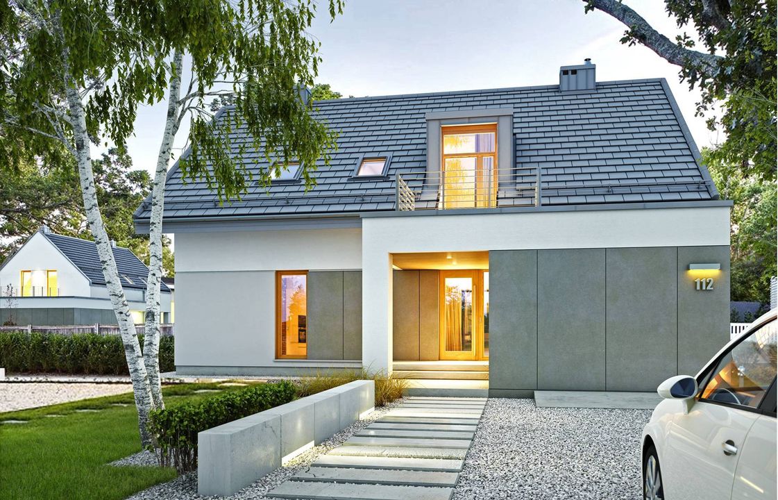 Fundamenty: tradycyjne - ławy i stopy żelbetowe. Ściany: bloczek silikatowy + styropian - na etapie adaptacji projektu istnieje możliwość zamiany bloczka silikatowego na inny materiał o podobnych parametrach wytrzymałosciowych, np. na pustak ceramiczny. Elewacja: tynk, płyta elewacyjna z włóknocementu - płytę elewacyjną z włóknocementu wykorzystaną jako materiał dekoracyjny można zamienić na etapie adaptacji projektu na inny, np. na deskę elewacyjną. Stropy: żelbetowe wylewane - na etapie adaptacji projektu istnieje możliwość zmiany technologii stropu na gęstożebrowy lub prefabrykowany. Schody: żelbetowe -Dach: dachówka ceramiczna lub cementowa - konstrukcja więźby przewidziana pod pokrycie ciężkie dla I strefy wiatrowej i II strefy śniegowej.