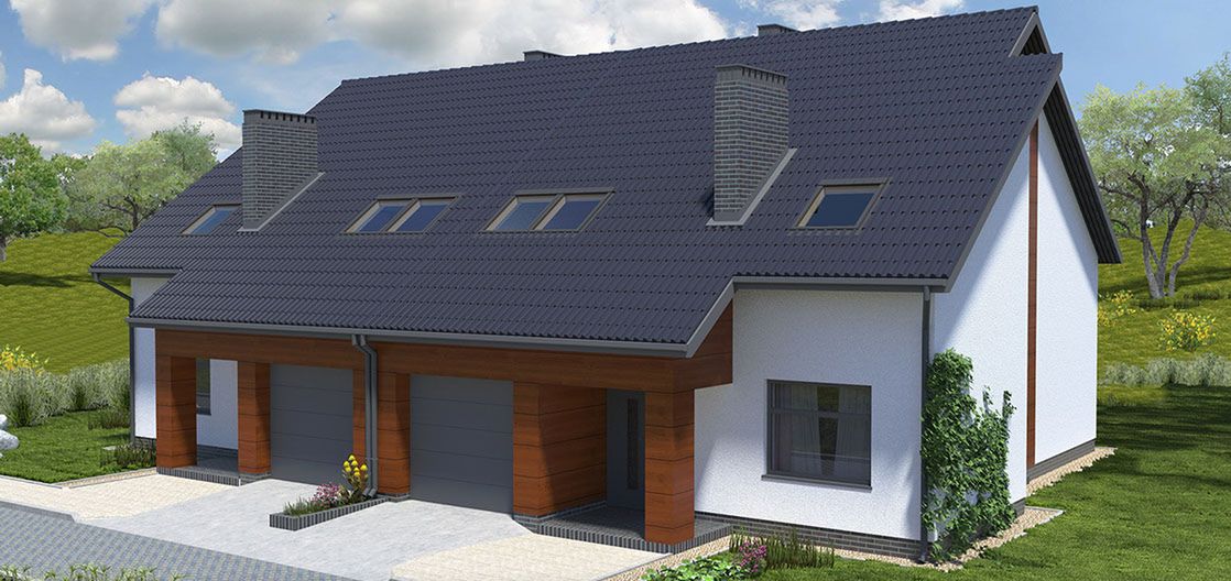 Graficzne opracowanie rzutów poglądowych widocznych na karcie projektu zostało wykonane przez Extradom.pl. Prezentowane przez Extradom.pl wizualizacje wykonane zostały przez autora projektu i należy poczytywać je jedynie za przykład i propozycję wykończenia, wizję architektoniczną autora projektu. Ostateczne wykończenie budynku może nastąpić na wiele sposobów. Szczegółowe rozwiązania zastosowane w oferowanej dokumentacji - w tym również ilość, lokalizacje i wygląd okien, drzwi, kominów - mogą w niewielkim stopniu różnić się od prezentowanej wizualizacji budynku.