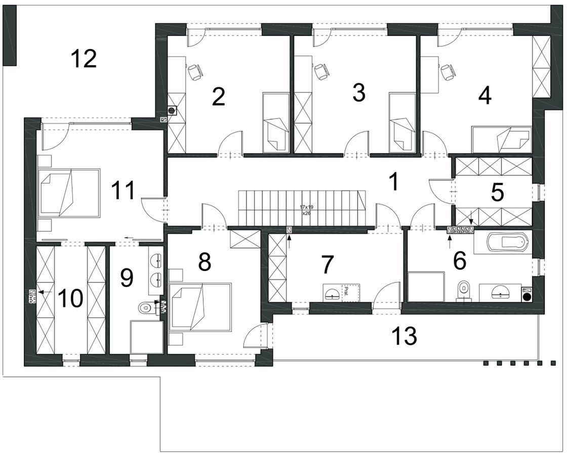 Graficzne opracowanie rzutów poglądowych widocznych na karcie projektu zostało wykonane przez Extradom.pl. Prezentowane przez Extradom.pl wizualizacje wykonane zostały przez autora projektu i należy poczytywać je jedynie za przykład i propozycję wykończenia, wizję architektoniczną autora projektu. Ostateczne wykończenie budynku może nastąpić na wiele sposobów. Szczegółowe rozwiązania zastosowane w oferowanej dokumentacji - w tym również ilość, lokalizacje i wygląd okien, drzwi, kominów - mogą w niewielkim stopniu różnić się od prezentowanej wizualizacji budynku.