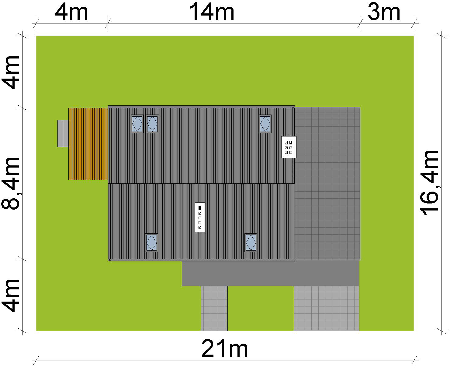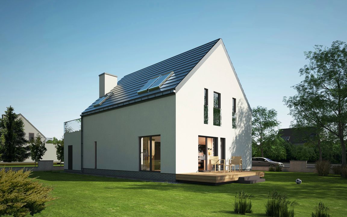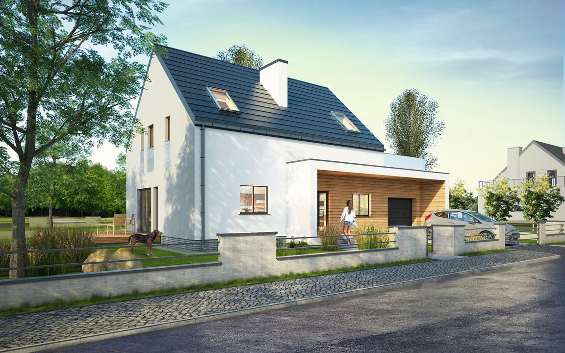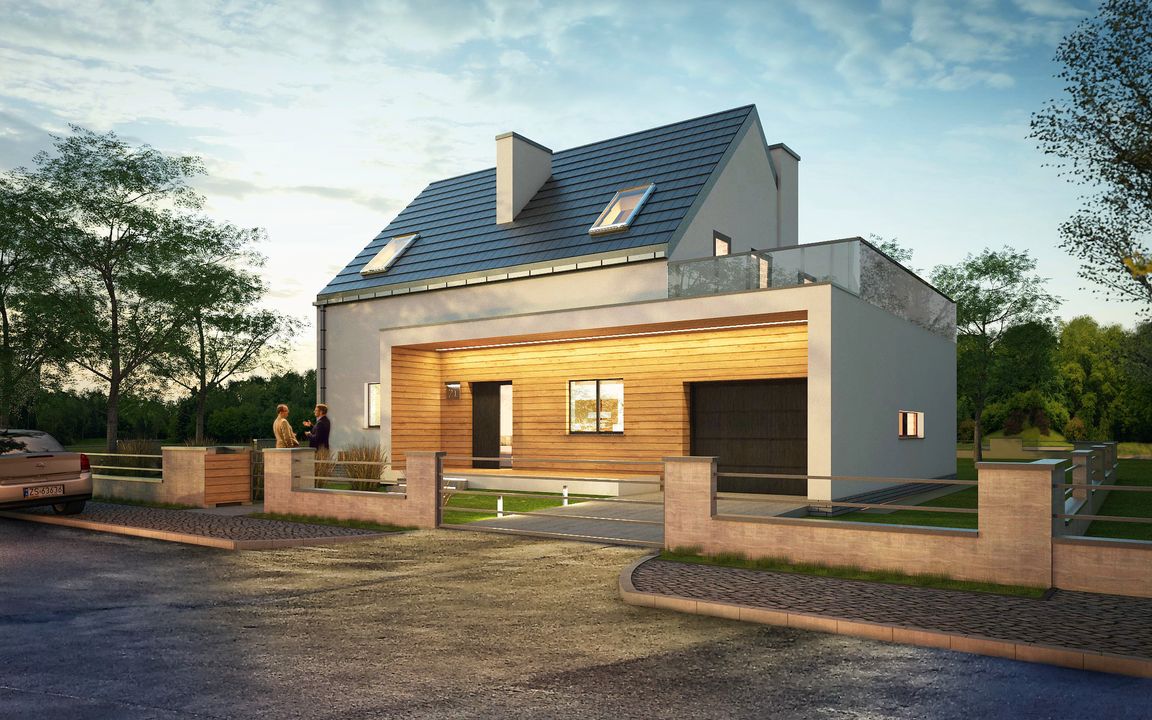 Graficzne opracowanie rzutów poglądowych widocznych na karcie projektu zostało wykonane przez Extradom.pl. Prezentowane przez Extradom.pl wizualizacje wykonane zostały przez autora projektu i należy poczytywać je jedynie za przykład i propozycję wykończenia, wizję architektoniczną autora projektu. Ostateczne wykończenie budynku może nastąpić na wiele sposobów. Szczegółowe rozwiązania zastosowane w oferowanej dokumentacji - w tym również ilość, lokalizacje i wygląd okien, drzwi, kominów - mogą w niewielkim stopniu różnić się od prezentowanej wizualizacji budynku.