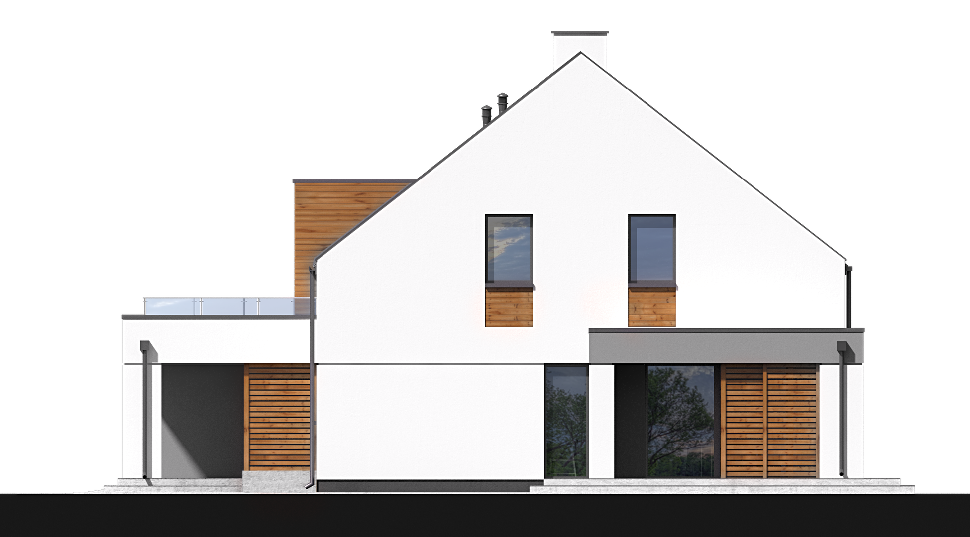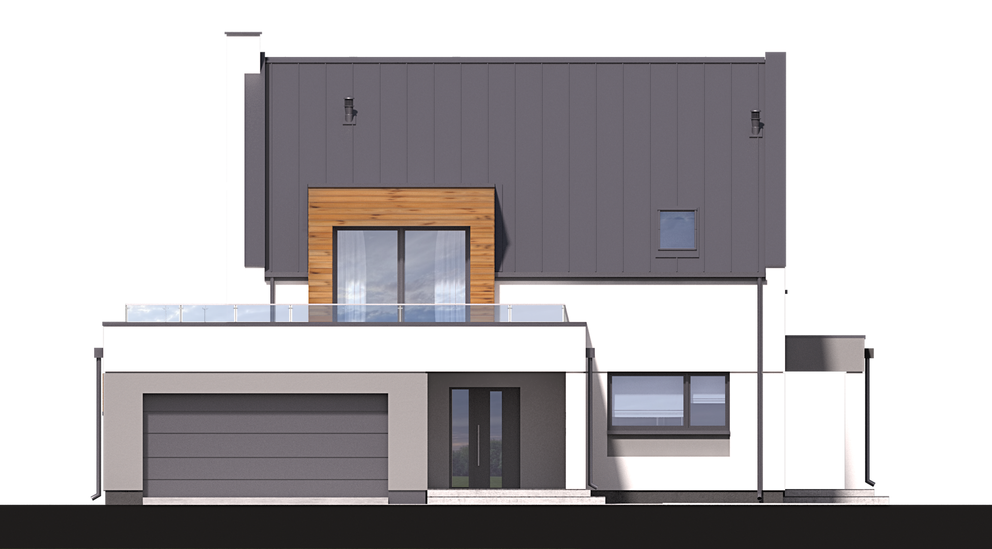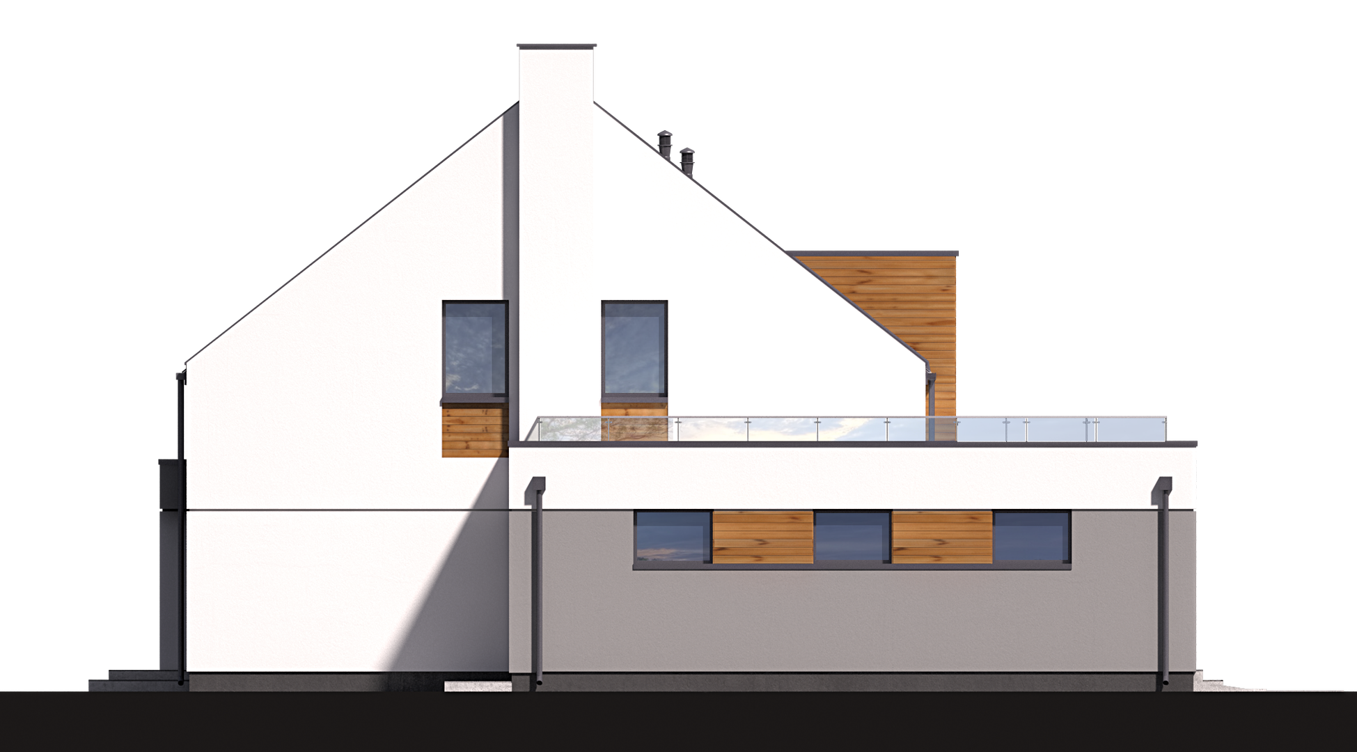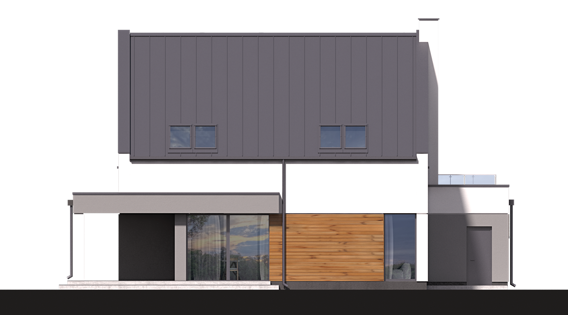 Graficzne opracowanie rzutów poglądowych widocznych na karcie projektu zostało wykonane przez Extradom.pl. Prezentowane przez Extradom.pl wizualizacje wykonane zostały przez autora projektu i należy poczytywać je jedynie za przykład i propozycję wykończenia, wizję architektoniczną autora projektu. Ostateczne wykończenie budynku może nastąpić na wiele sposobów. Szczegółowe rozwiązania zastosowane w oferowanej dokumentacji - w tym również ilość, lokalizacje i wygląd okien, drzwi, kominów - mogą w niewielkim stopniu różnić się od prezentowanej wizualizacji budynku.