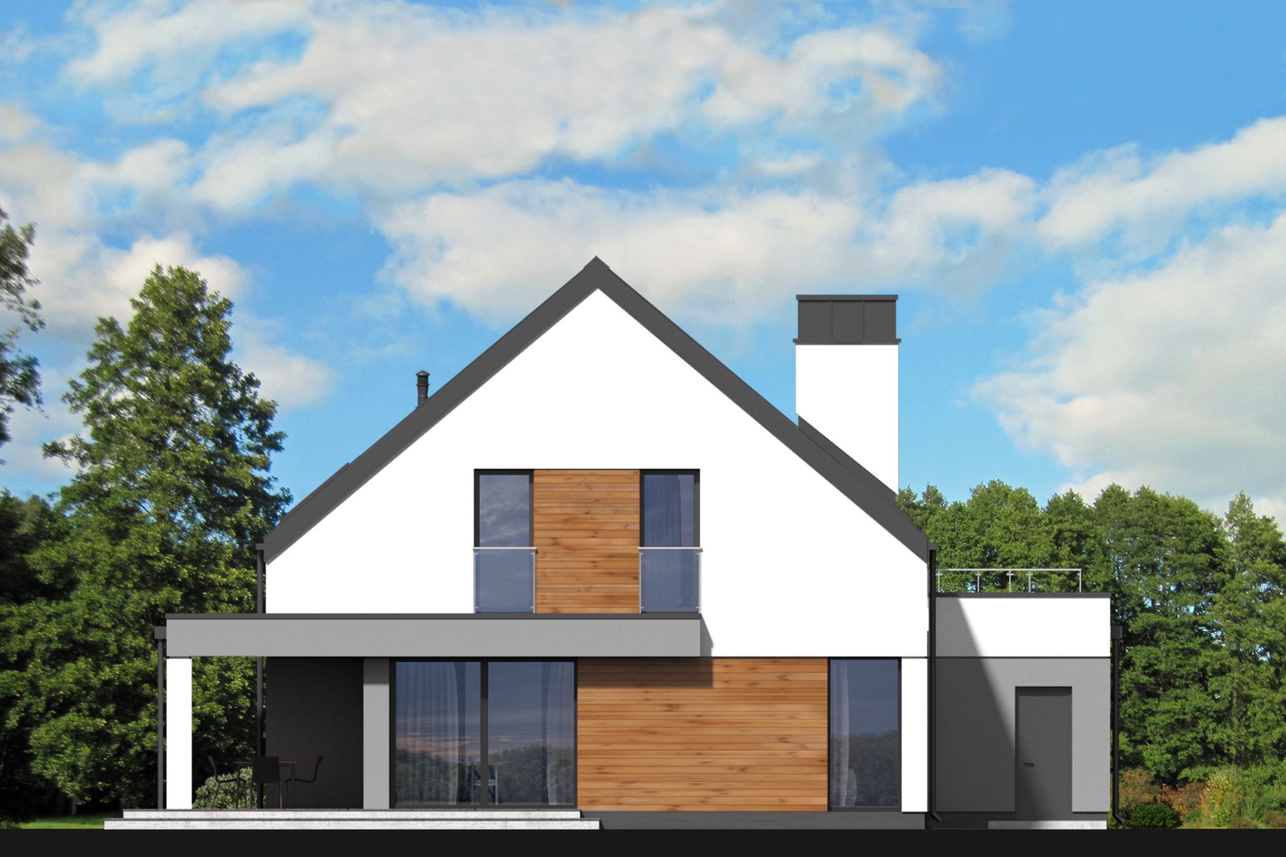Graficzne opracowanie rzutów poglądowych widocznych na karcie projektu zostało wykonane przez Extradom.pl. Prezentowane przez Extradom.pl wizualizacje wykonane zostały przez autora projektu i należy poczytywać je jedynie za przykład i propozycję wykończenia, wizję architektoniczną autora projektu. Ostateczne wykończenie budynku może nastąpić na wiele sposobów. Szczegółowe rozwiązania zastosowane w oferowanej dokumentacji - w tym również ilość, lokalizacje i wygląd okien, drzwi, kominów - mogą w niewielkim stopniu różnić się od prezentowanej wizualizacji budynku.