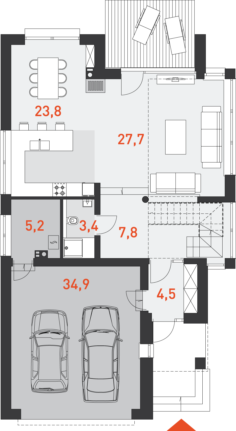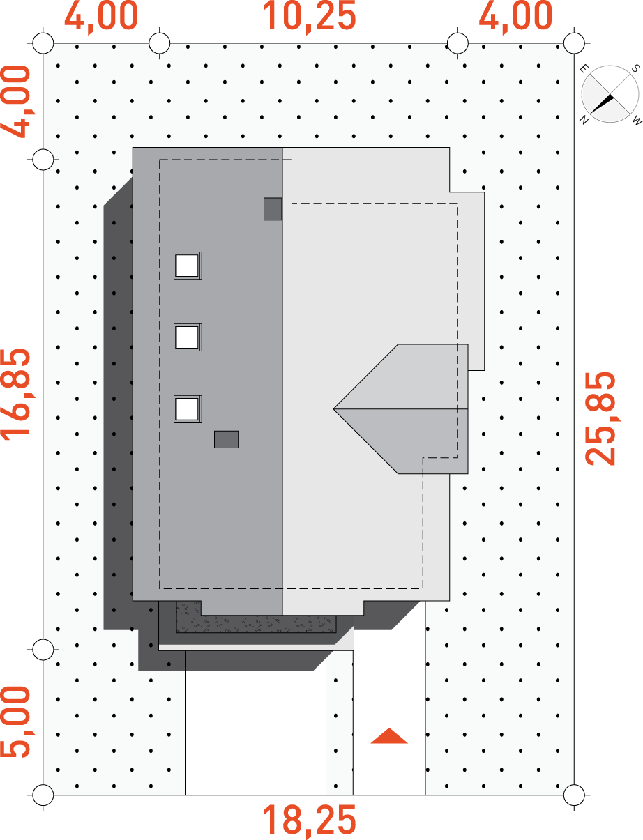 Konstrukcja: zgodna z normami EUROKOD. Fundamenty: tradycyjne ławy i stopy żelbetowe. Ściany: pustak ceramiczny + styropian na etapie adaptacji projektu istnieje możliwość zamiany pustaka ceramicznego na inny materiał o podobnych parametrach wytrzymałosciowych, np. na bloczek silikatowy. Elewacja: tynk, płytka klinkierowa ręcznie formowana płytkę klinkierową wykorzystaną jako materiał dekoracyjny można zamienić na etapie adaptacji projektu na inny, np. na deskę elewacyjną. Stropy: żelbetowe wylewane na etapie adaptacji projektu istnieje możliwość zmiany technologii stropu na gęstożebrowy lub prefabrykowany. Schody: konstrukcji lekkiej konstrukcja oraz materiały wykończeniowe schodów przewidziane do indywidualnej aranżacji. Możesz skorzystać z usług naszego Partnera. Formularz ofertowy dostępny w zakładce „kosztorys”. Dach: dachówka ceramiczna lub cementowa konstrukcja więźby przewidziana pod pokrycie ciężkie dla I strefy wiatrowej i II strefy śniegowej.