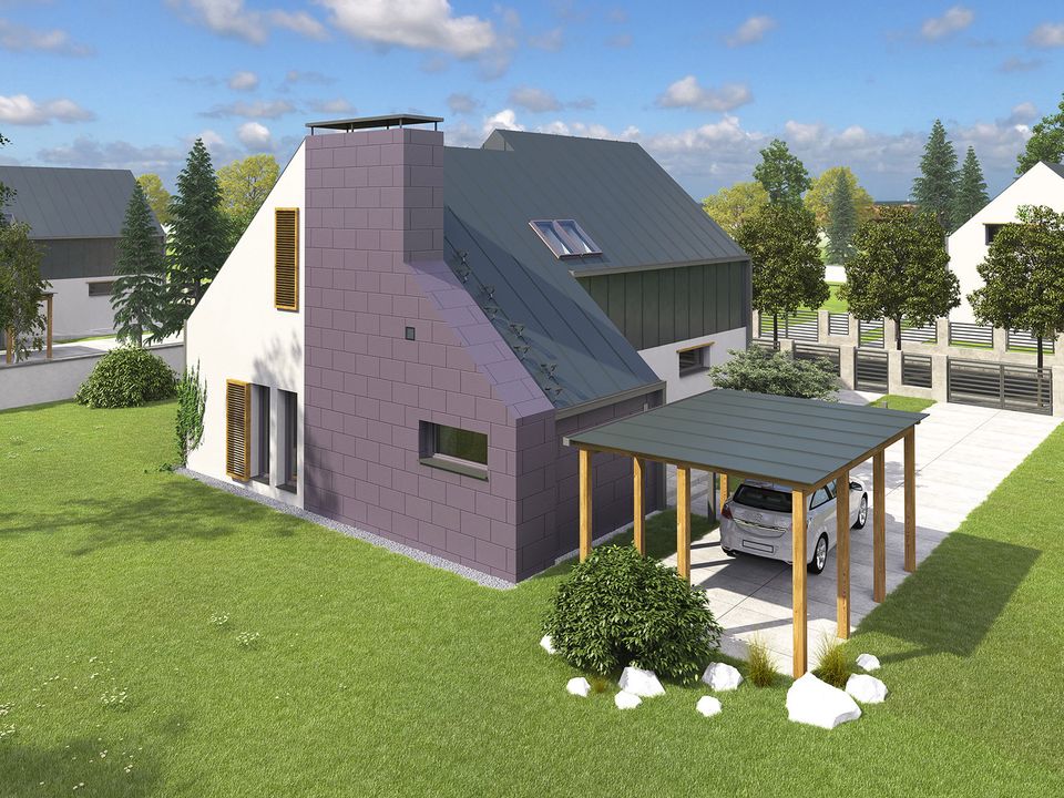 Graficzne opracowanie rzutów poglądowych widocznych na karcie projektu zostało wykonane przez Extradom.pl. Prezentowane przez Extradom.pl wizualizacje wykonane zostały przez autora projektu i należy poczytywać je jedynie za przykład i propozycję wykończenia, wizję architektoniczną autora projektu. Ostateczne wykończenie budynku może nastąpić na wiele sposobów. Szczegółowe rozwiązania zastosowane w oferowanej dokumentacji - w tym również ilość, lokalizacje i wygląd okien, drzwi, kominów - mogą w niewielkim stopniu różnić się od prezentowanej wizualizacji budynku.
