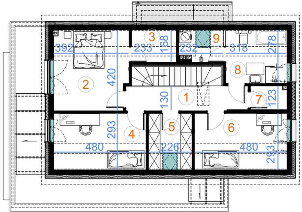 Graficzne opracowanie rzutów poglądowych widocznych na karcie projektu zostało wykonane przez Extradom.pl. Prezentowane przez Extradom.pl wizualizacje wykonane zostały przez autora projektu i należy poczytywać je jedynie za przykład i propozycję wykończenia, wizję architektoniczną autora projektu. Ostateczne wykończenie budynku może nastąpić na wiele sposobów. Szczegółowe rozwiązania zastosowane w oferowanej dokumentacji - w tym również ilość, lokalizacje i wygląd okien, drzwi, kominów - mogą w niewielkim stopniu różnić się od prezentowanej wizualizacji budynku.