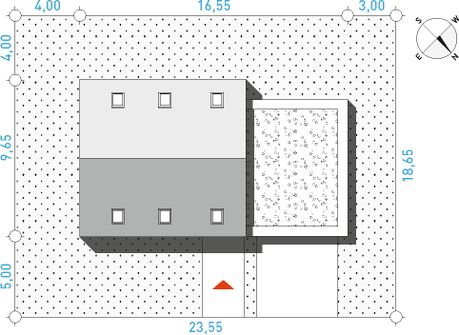 Konstrukcja: zgodna z normami EUROKOD. Fundamenty: tradycyjne ławy i stopy żelbetowe. Ściany: bloczek silikatowy + styropian na etapie adaptacji można zamienić na inny materiał o tej samej wytrzymałości na ściskanie 10-15 MPa, np. pustak ceramiczny. Elewacja: tynk, na fragmentach deska kompozytowa lamelowa materiał dodatkowy podkreślający podziały elewacji, taki jak deska kompozytowa można zamienić na inny, np. drewno. Stropy: żelbetowe wylewane na etapie adaptacji istnieje możliwość zmiany na stropy gęstożebrowe. Schody: żelbetowe konstrukcja schodów żelbetowa uwzględniona w dokumentacji projektowej. Materiał wykończenia stopni oraz balustrady do indywidualnej aranżacji. Dach: system blachy dachowej Ruukki Classic M konstrukcja więźby przewidziana pod pokrycie ciężkie dla I strefy wiatrowej i II strefy śniegowej.