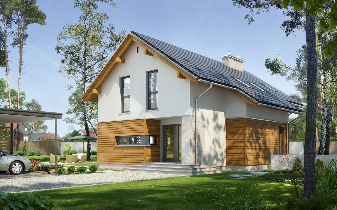 Ściany: bloczek silikatowy + styropian - na etapie adaptacji projektu istnieje możliwość zamiany bloczka silikatowego na inny materiał o podobnych parametrach wytrzymałosciowych, np. na pustak ceramiczny. Elewacja: tynk, płytka kliknierowa ręcznie formowana, deska elewacyjna - Stropy: żelbetowe wylewane - na etapie adaptacji projektu istnieje możliwość zmiany technologii stropu na gęstożebrowy lub prefabrykowany. Schody: żelbetowe -Dach: dachówka ceramiczna lub cementowa - konstrukcja więźby przewidziana pod pokrycie ciężkie dla I strefy wiatrowej i II strefy śniegowej.