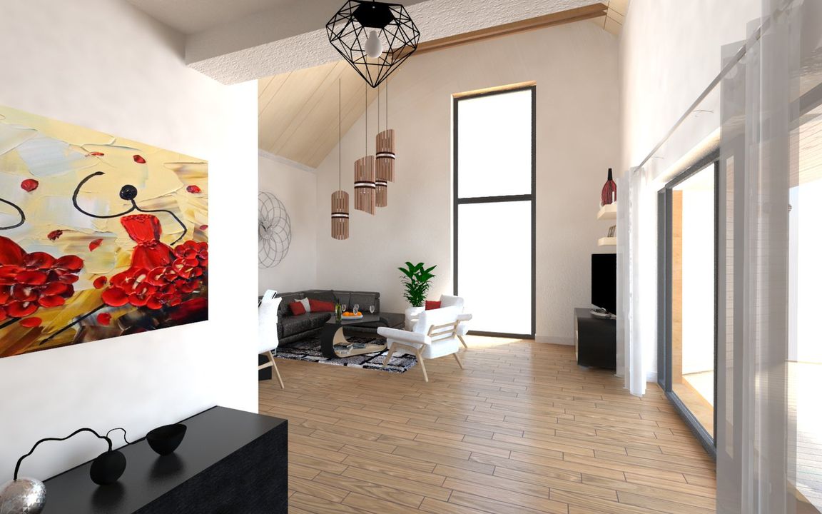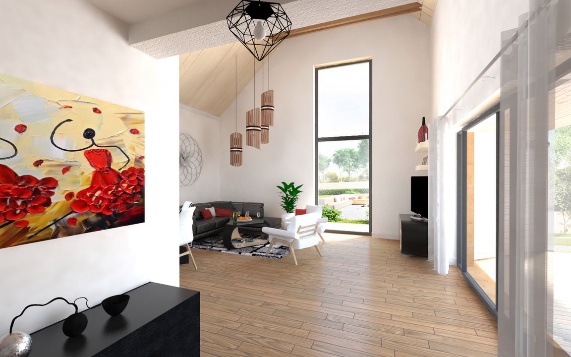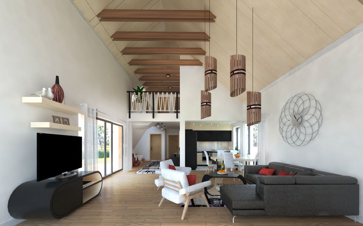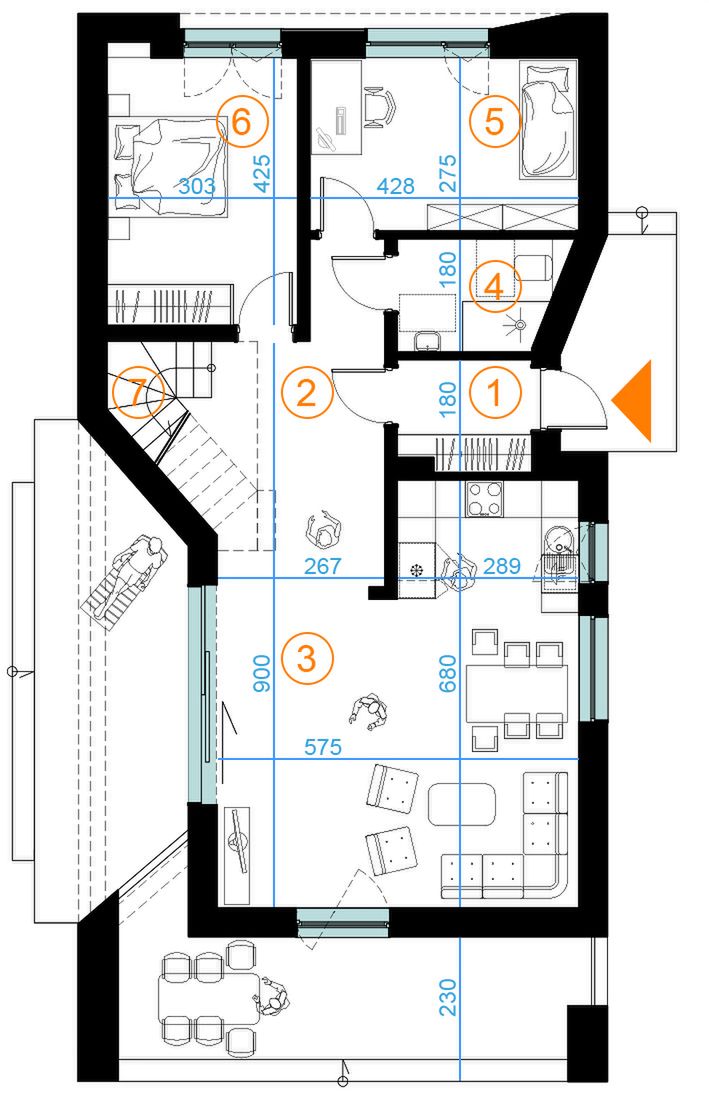 Graficzne opracowanie rzutów poglądowych widocznych na karcie projektu zostało wykonane przez Extradom.pl. Prezentowane przez Extradom.pl wizualizacje wykonane zostały przez autora projektu i należy poczytywać je jedynie za przykład i propozycję wykończenia, wizję architektoniczną autora projektu. Ostateczne wykończenie budynku może nastąpić na wiele sposobów. Szczegółowe rozwiązania zastosowane w oferowanej dokumentacji - w tym również ilość, lokalizacje i wygląd okien, drzwi, kominów - mogą w niewielkim stopniu różnić się od prezentowanej wizualizacji budynku.