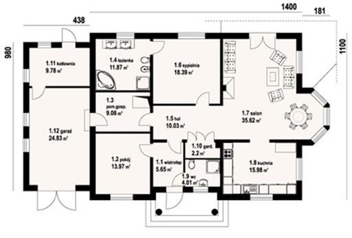Graficzne opracowanie rzutów poglądowych widocznych na karcie projektu zostało wykonane przez Extradom.pl. Prezentowane przez Extradom.pl wizualizacje wykonane zostały przez autora projektu i należy poczytywać je jedynie za przykład i propozycję wykończenia, wizję architektoniczną autora projektu. Ostateczne wykończenie budynku może nastąpić na wiele sposobów. Szczegółowe rozwiązania zastosowane w oferowanej dokumentacji - w tym również ilość, lokalizacje i wygląd okien, drzwi, kominów - mogą w niewielkim stopniu różnić się od prezentowanej wizualizacji budynku.