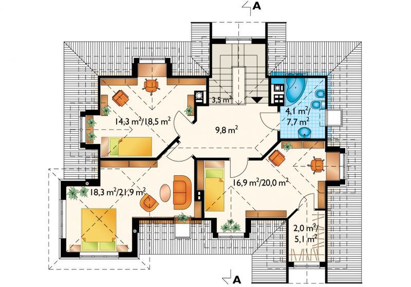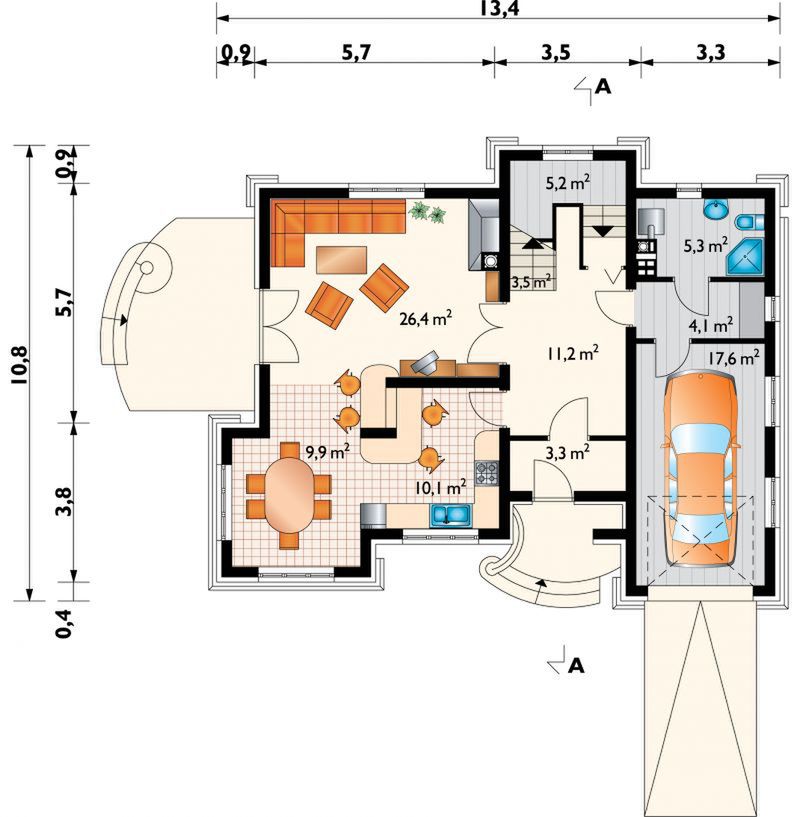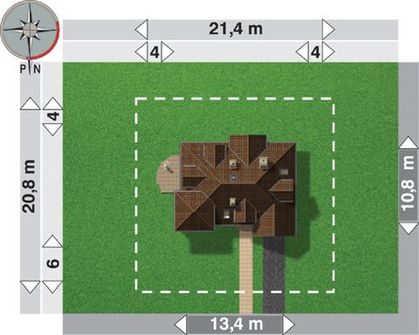 Graficzne opracowanie rzutów poglądowych widocznych na karcie projektu zostało wykonane przez Extradom.pl. Prezentowane przez Extradom.pl wizualizacje wykonane zostały przez autora projektu i należy poczytywać je jedynie za przykład i propozycję wykończenia, wizję architektoniczną autora projektu. Ostateczne wykończenie budynku może nastąpić na wiele sposobów. Szczegółowe rozwiązania zastosowane w oferowanej dokumentacji - w tym również ilość, lokalizacje i wygląd okien, drzwi, kominów - mogą w niewielkim stopniu różnić się od prezentowanej wizualizacji budynku.