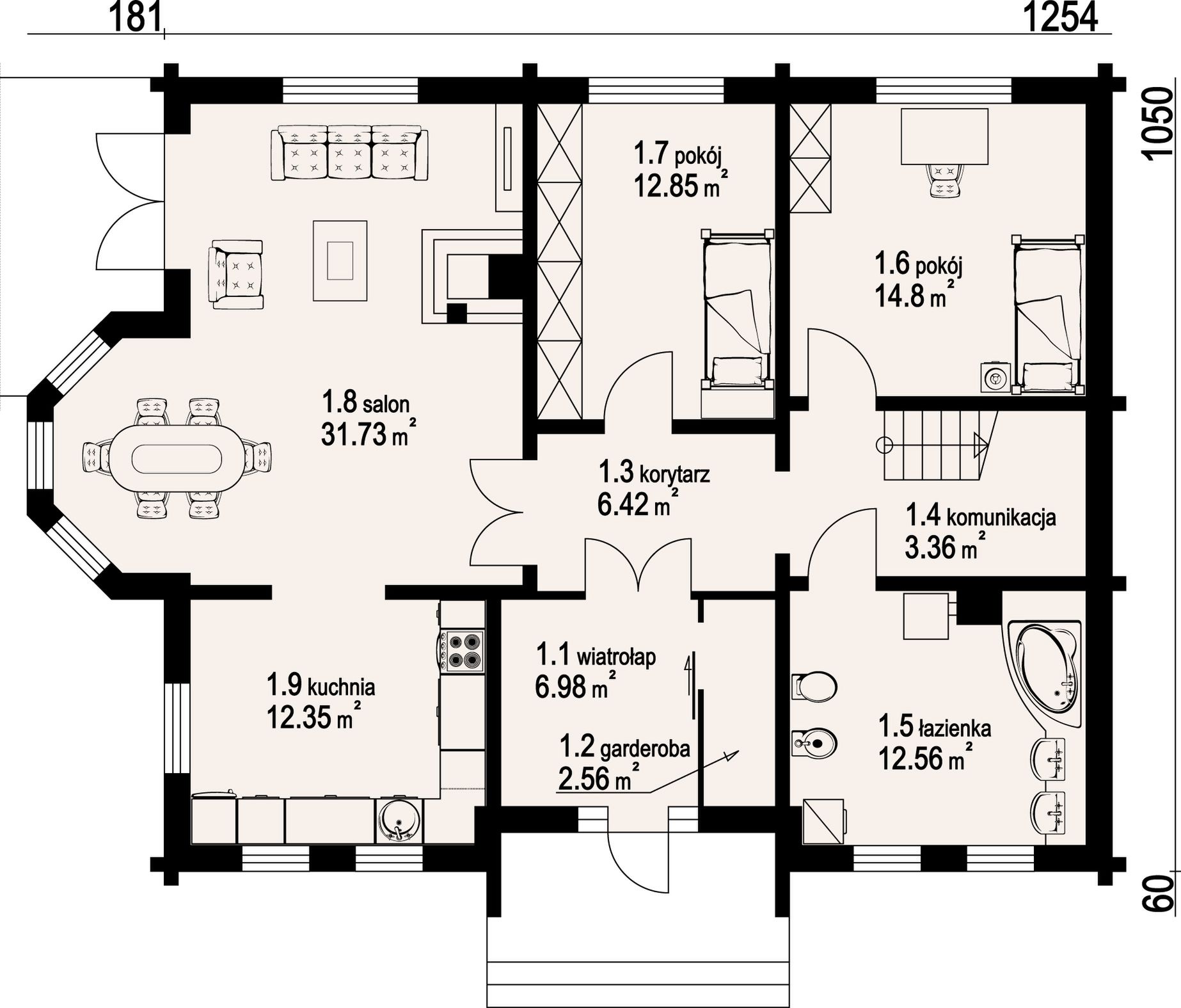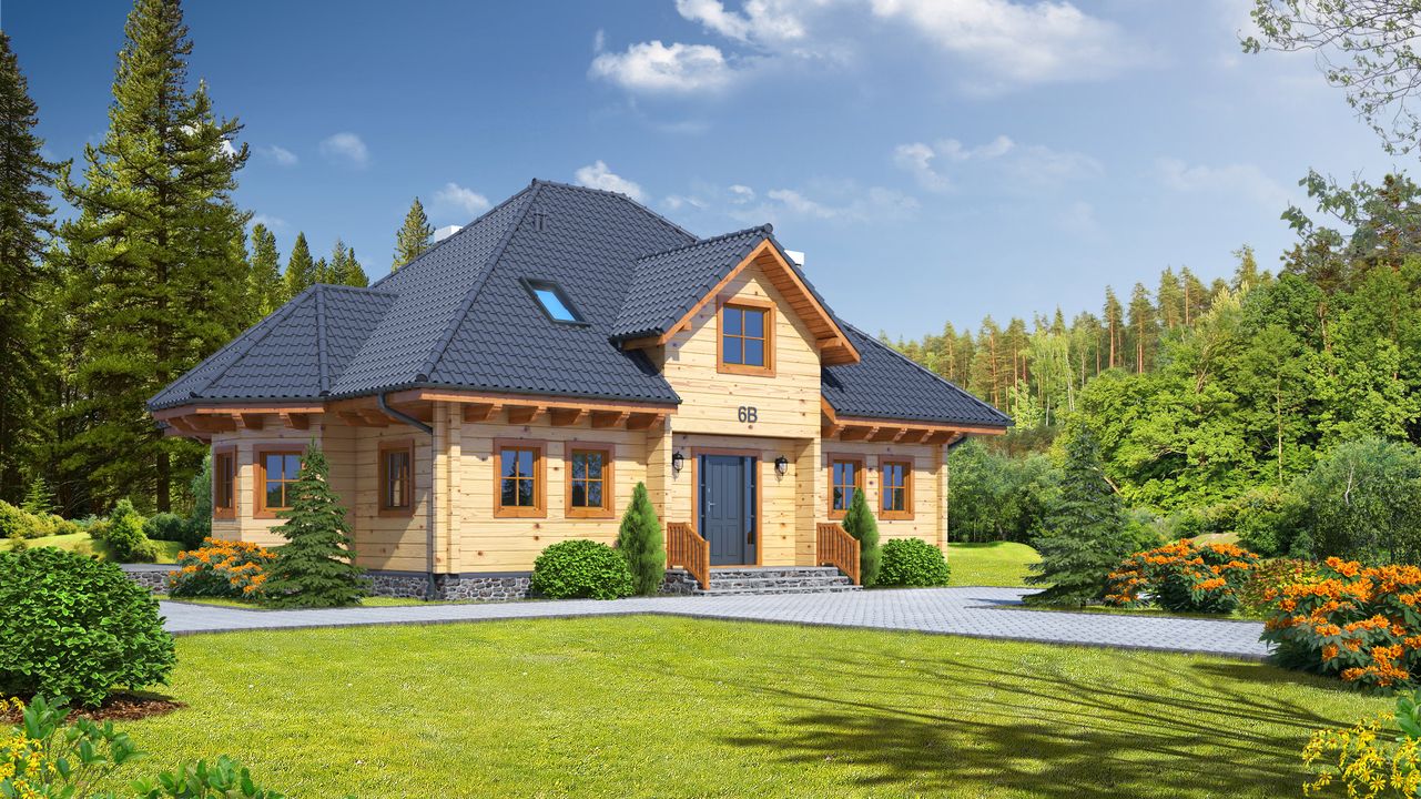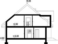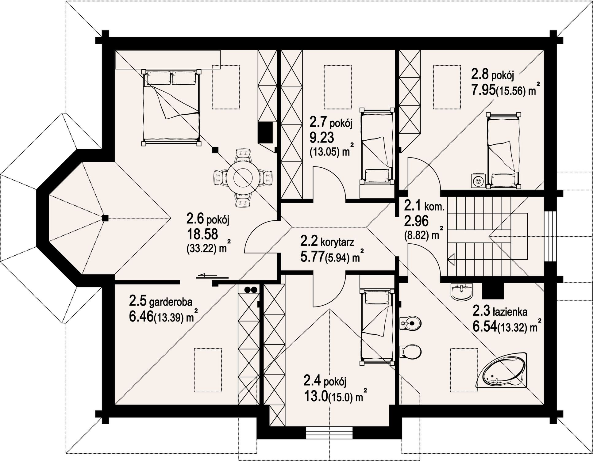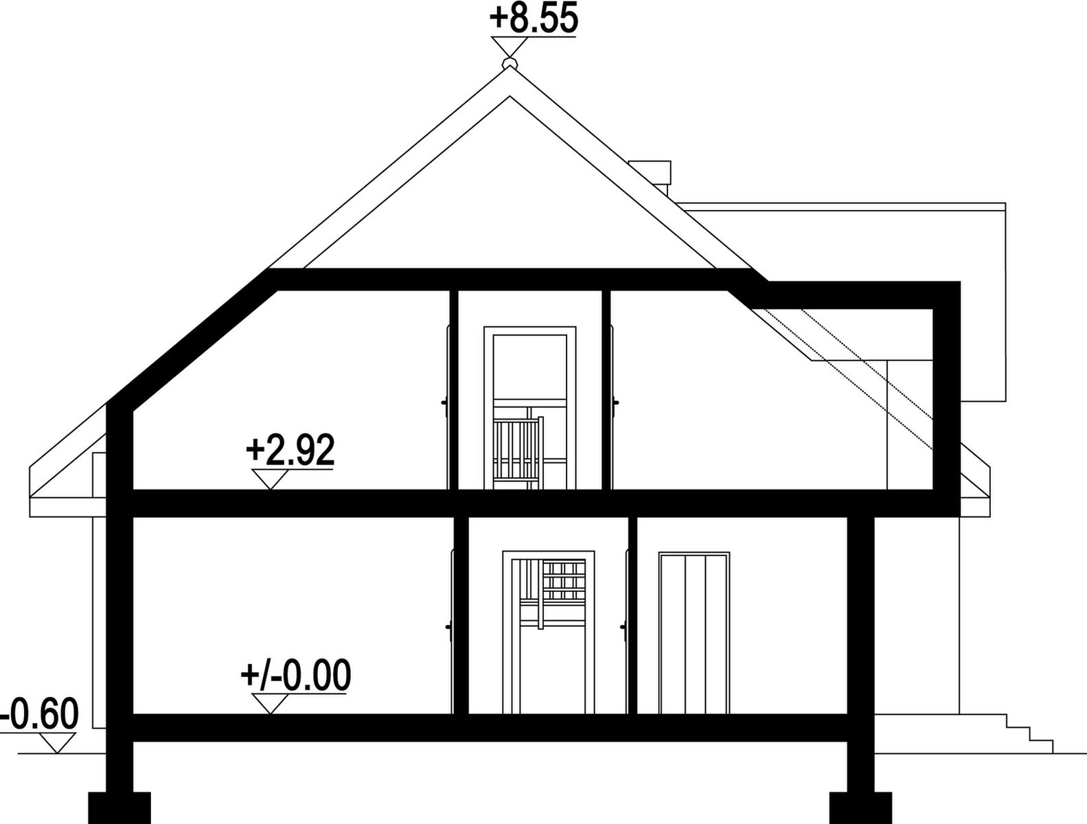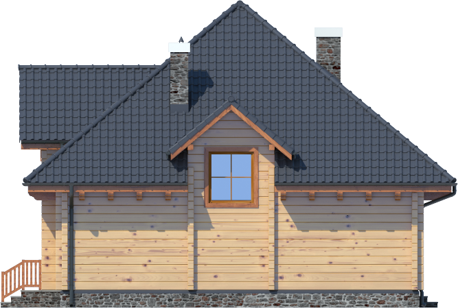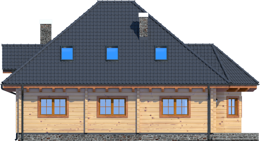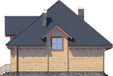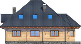Wys. ścianki kolankowej 0.86 m Ilość drewna na więźbę 15.55 m³. Strop: drewniany. Pokrycie dachu: dachówka gontopodobna z posypką Gerard Corona. Ściany wewnętrzne: płazy drewniane. Ściany zewnętrzne: płazy drewniane + wełna mineralna + deska. Typ ogrzewania: kocioł gazowy.