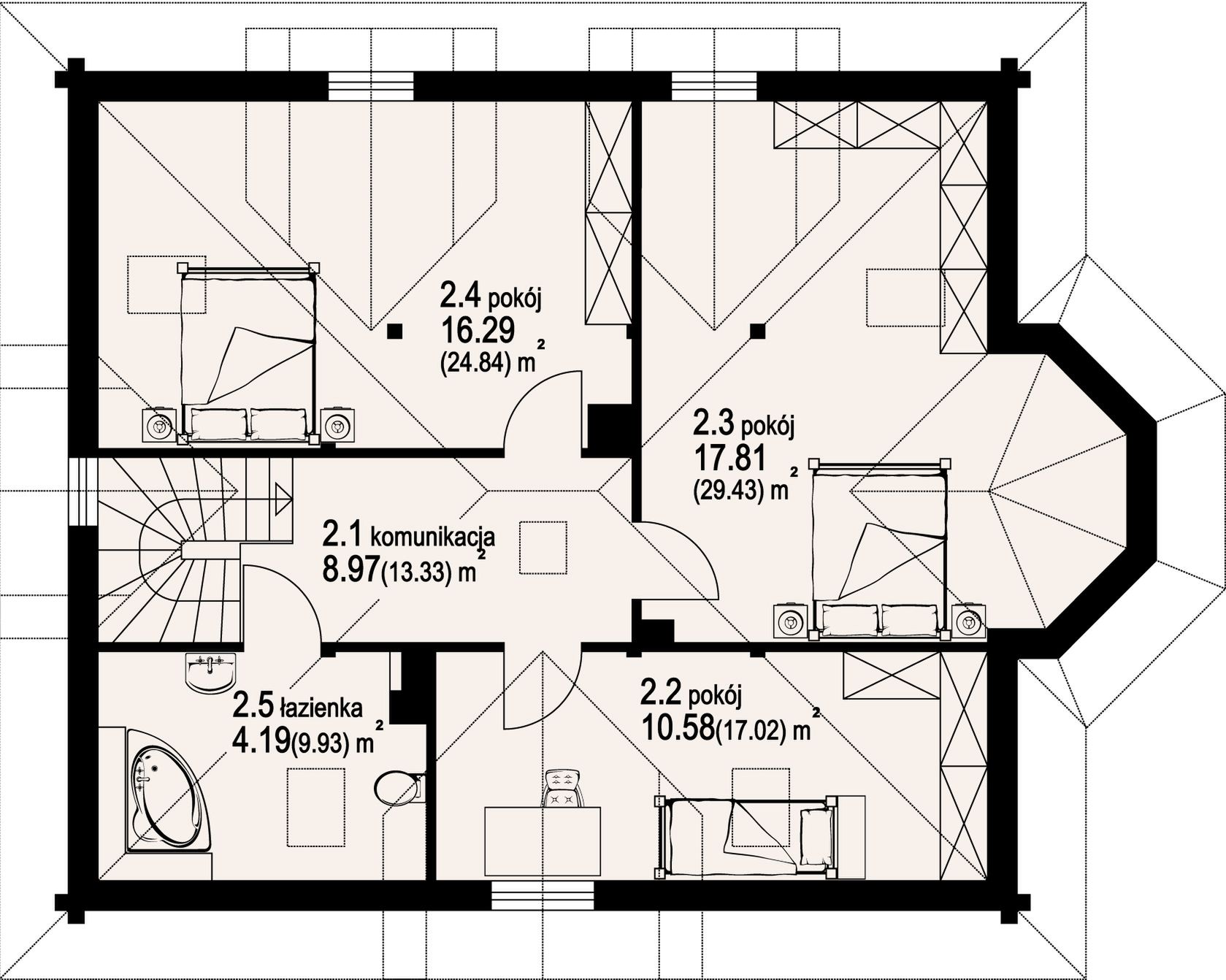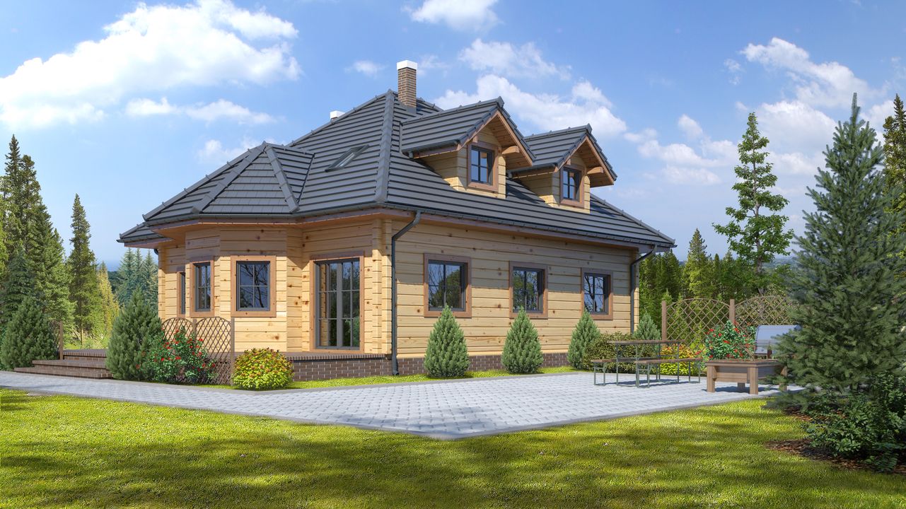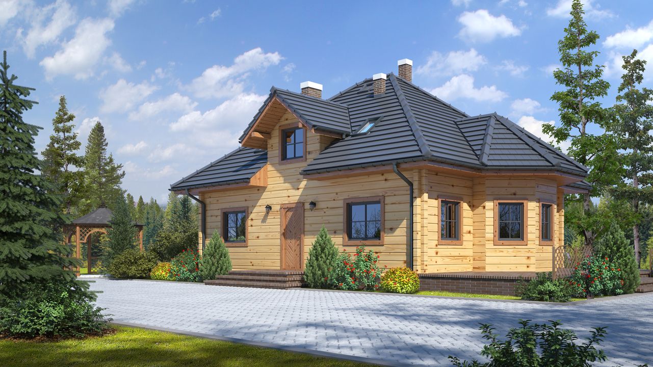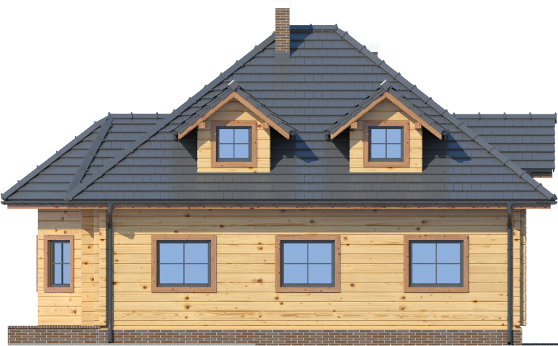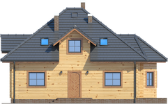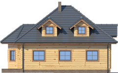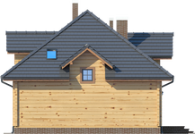 Wysokość ścianki kolankowej: 0.76 m. Ilość drewna na więźbę: 6 m³. Strop: drewniany. Pokrycie dachu: dachówka gontopodobna z posypką Gerard Corona. Ściany zewnętrzne: płazy drewniane + wełna mineralna + deska. Ściany wewnętrzne: płazy drewniane. Typ ogrzewania: kocioł gazowy. Inne: okna połaciowe Fakro.