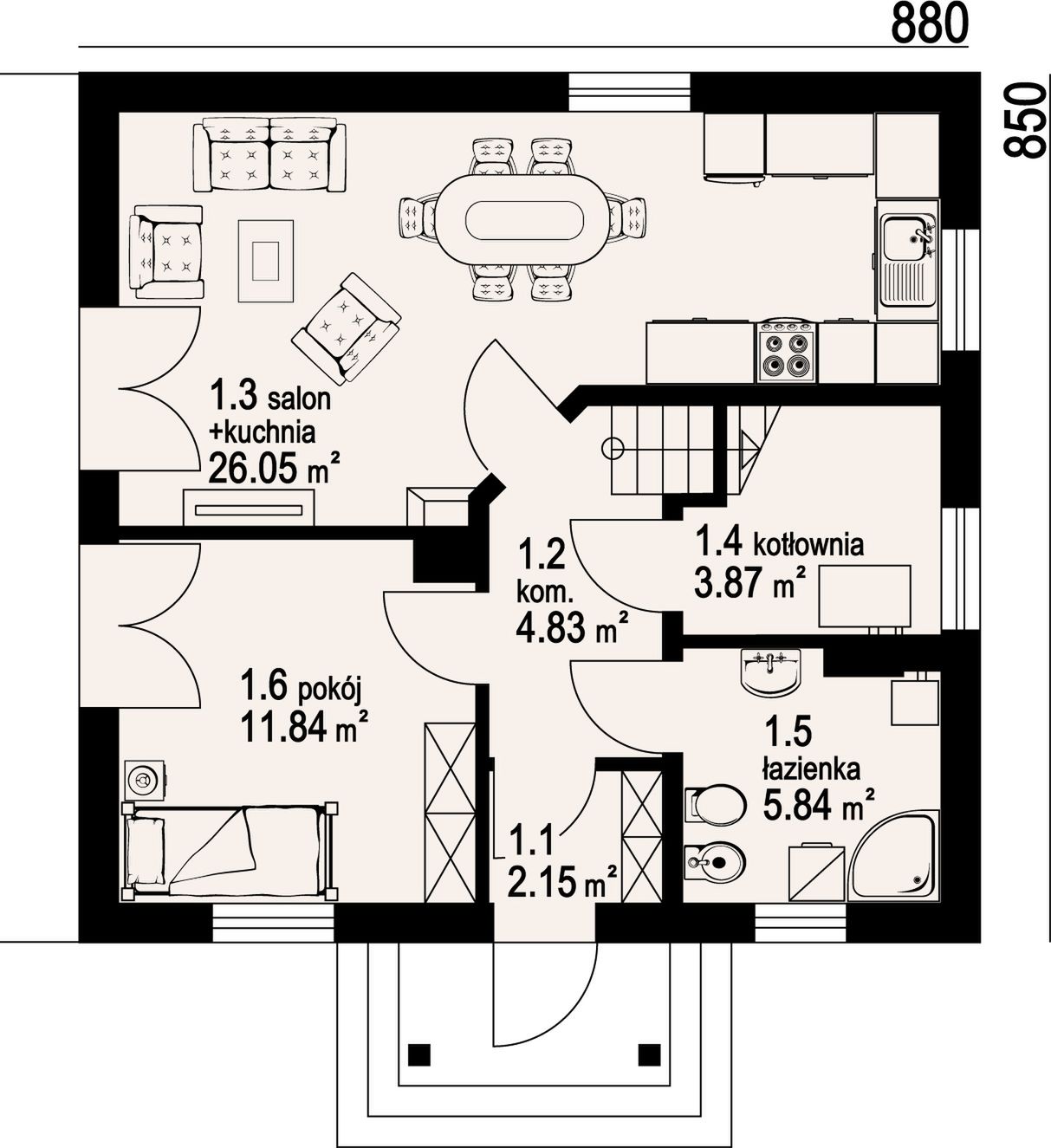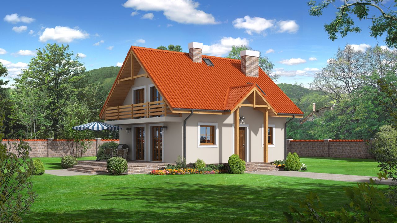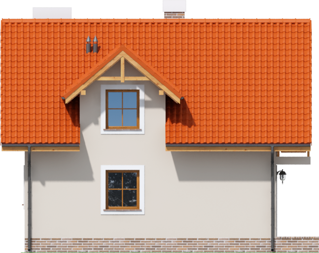 Graficzne opracowanie rzutów poglądowych widocznych na karcie projektu zostało wykonane przez Extradom.pl. Prezentowane przez Extradom.pl wizualizacje wykonane zostały przez autora projektu i należy poczytywać je jedynie za przykład i propozycję wykończenia, wizję architektoniczną autora projektu. Ostateczne wykończenie budynku może nastąpić na wiele sposobów. Szczegółowe rozwiązania zastosowane w oferowanej dokumentacji - w tym również ilość, lokalizacje i wygląd okien, drzwi, kominów - mogą w niewielkim stopniu różnić się od prezentowanej wizualizacji budynku.