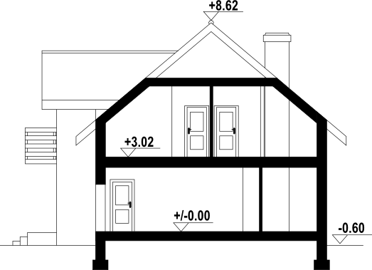 Wysokość ścianki kolankowej: 1.32 m. Strop: płyta żelbetowa. Pokrycie dachu: dachówka ceramiczna. Ściany zewnętrzne: pustaki ceramiczne + styropian. Ściany wewnętrzne: pustaki ceramiczne. Typ ogrzewania: kocioł gazowy.