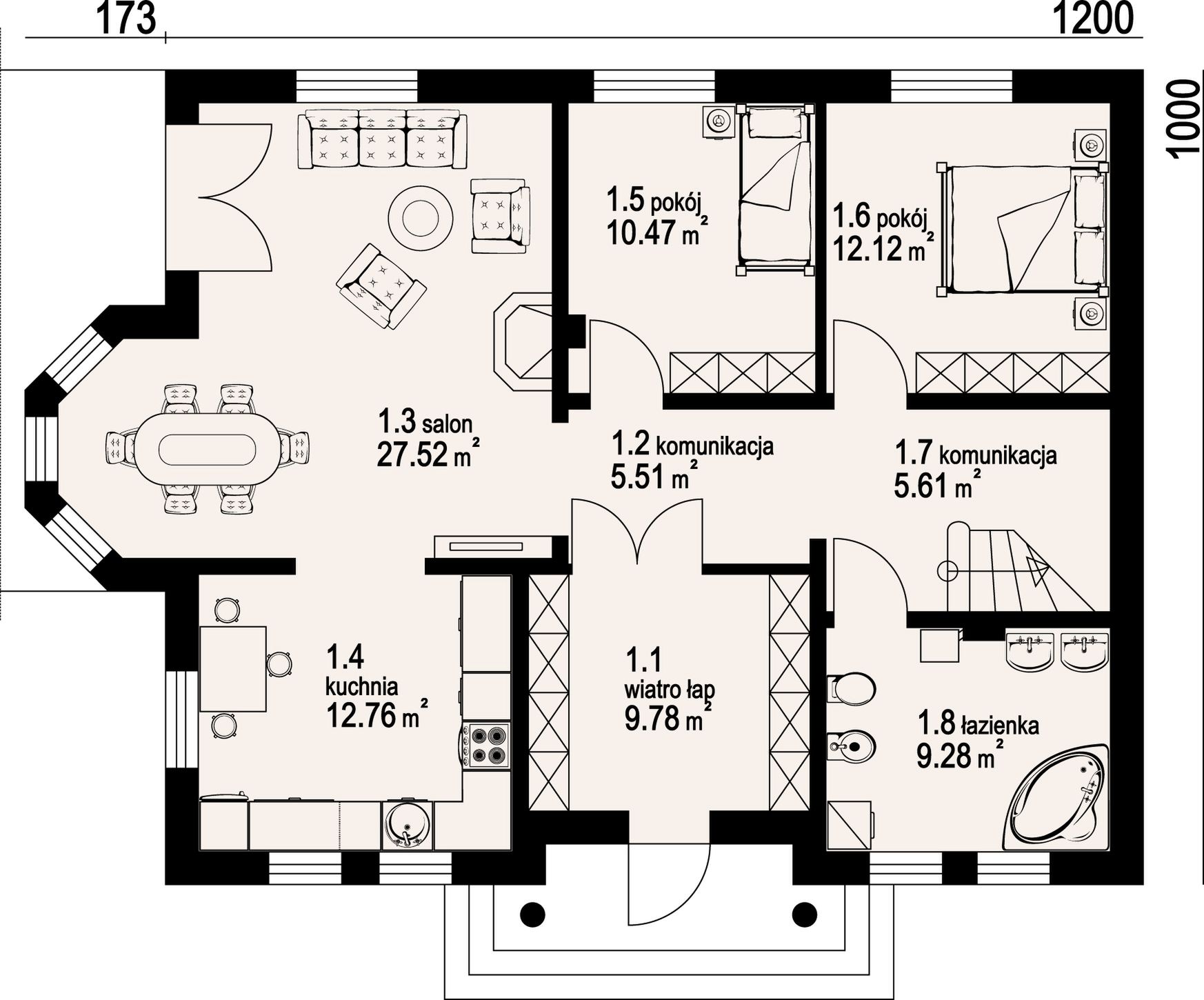 Wys. ścianki kolankowej 0.7 m Ilość drewna na więźbę 9.3 m³. Strop: płyta żelbetowa. Pokrycie dachu: dachówka ceramiczna. Ściany wewnętrzne: pustaki ceramiczne. Ściany zewnętrzne: pustaki ceramiczne + styropian. Typ ogrzewania: kocioł gazowy.
