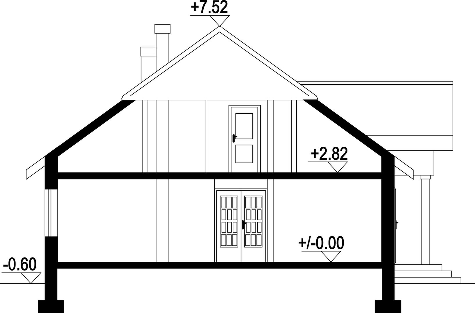 Wysokość ścianki kolankowej: 0.5 m. Ilość drewna na więźbę: 15.48 m³. Strop: płyta żelbetowa. Pokrycie dachu: dachówka ceramiczna. Ściany zewnętrzne: pustaki ceramiczne + styropian. Ściany wewnętrzne: pustaki ceramiczne. Typ ogrzewania: kocioł gazowy lub kocioł na paliwo stałe. Inne: okna połaciowe Fakro.