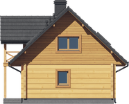 Wysokość ścianki kolankowej: 0.93 m. Strop: drewniany. Pokrycie dachu: dachówka gontopodobna Gerard Corona. Ściany zewnętrzne: płazy drewniane + wełna mineralna + deska. Ściany wewnętrzne: płazy drewniane. Typ ogrzewania: pompa ciepła. Inne: okna połaciowe Velux.