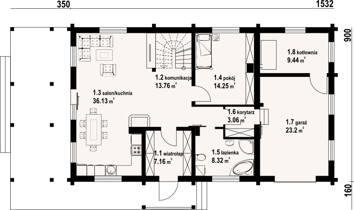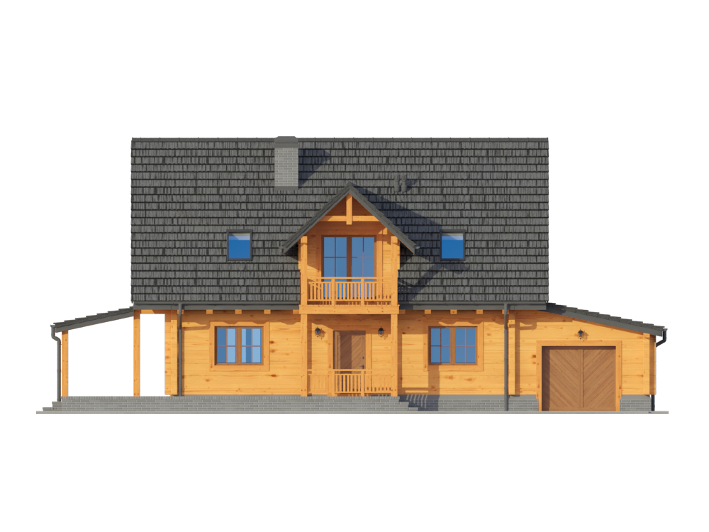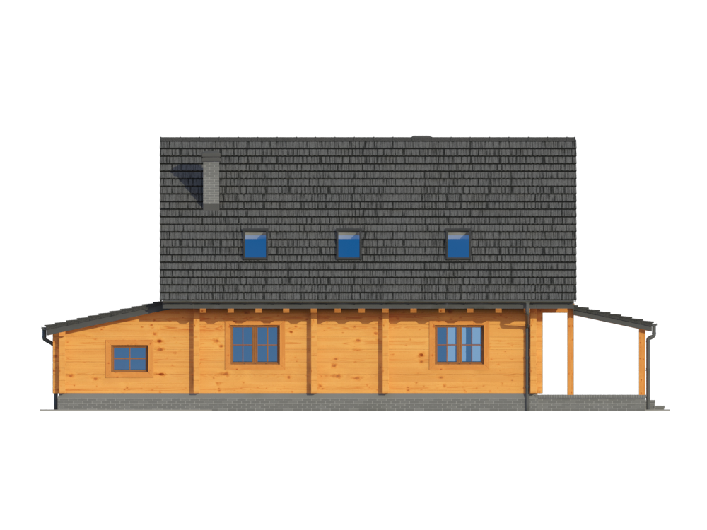 Graficzne opracowanie rzutów poglądowych widocznych na karcie projektu zostało wykonane przez Extradom.pl. Prezentowane przez Extradom.pl wizualizacje wykonane zostały przez autora projektu i należy poczytywać je jedynie za przykład i propozycję wykończenia, wizję architektoniczną autora projektu. Ostateczne wykończenie budynku może nastąpić na wiele sposobów. Szczegółowe rozwiązania zastosowane w oferowanej dokumentacji - w tym również ilość, lokalizacje i wygląd okien, drzwi, kominów - mogą w niewielkim stopniu różnić się od prezentowanej wizualizacji budynku.