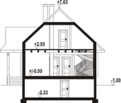 Wysokość ścianki kolankowej: 0.6 m. Strop: drewniany. Pokrycie dachu: dachówka ceramiczna. Ściany zewnętrzne: płazy drewniane + wełna mineralna + deska. Ściany wewnętrzne: płazy drewniane. Typ ogrzewania: kocioł gazowy.