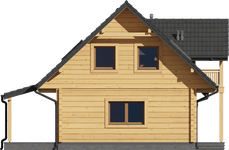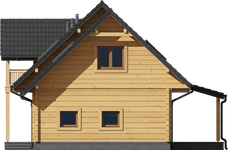 Wysokość ścianki kolankowej: 1.02 m. Strop: drewniany. Pokrycie dachu: dachówka ceramiczna. Ściany zewnętrzne: płazy drewniane + wełna mineralna + deska. Ściany wewnętrzne: płazy drewniane. Typ ogrzewania: pompa ciepła.