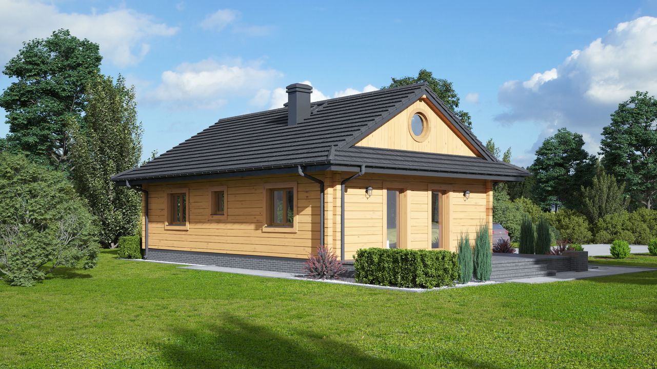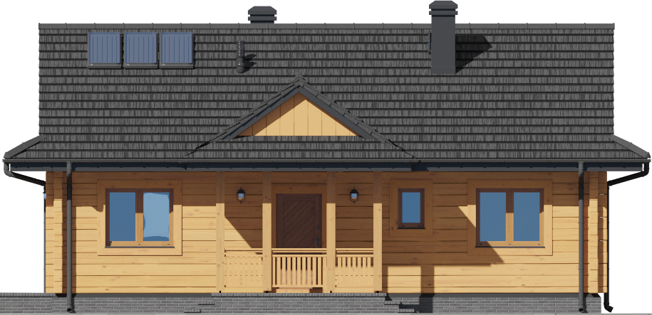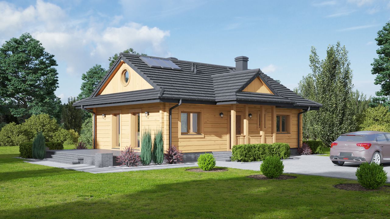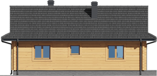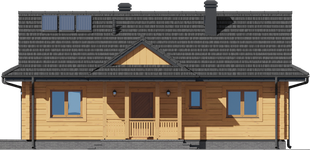 Wysokość ścianki kolankowej: 0.15 m. Ilość drewna na więźbę: 6.36 m³. Strop: drewniany. Pokrycie dachu: dachówka gontopodobna Gerard Corona. Ściany zewnętrzne: płazy drewniane + wełna mineralna + deska. Ściany wewnętrzne: płazy drewniane. Typ ogrzewania: kocioł gazowy lub kocioł na paliwo stałe. Instalacje dodatkowe: instalacja solarna.