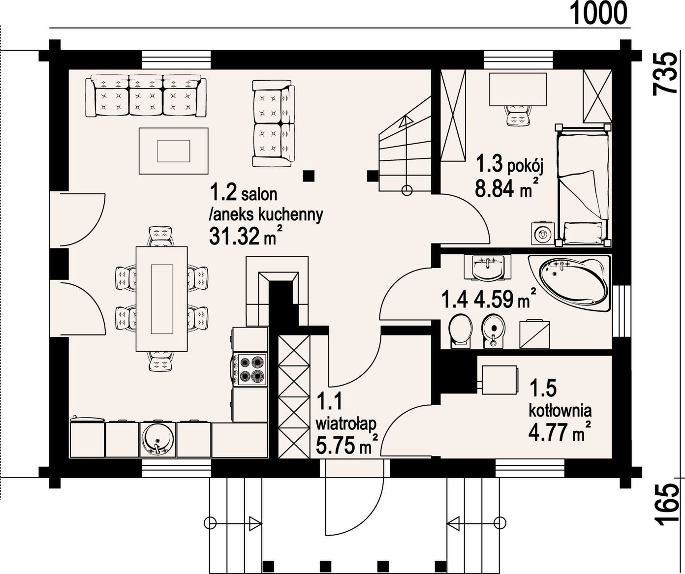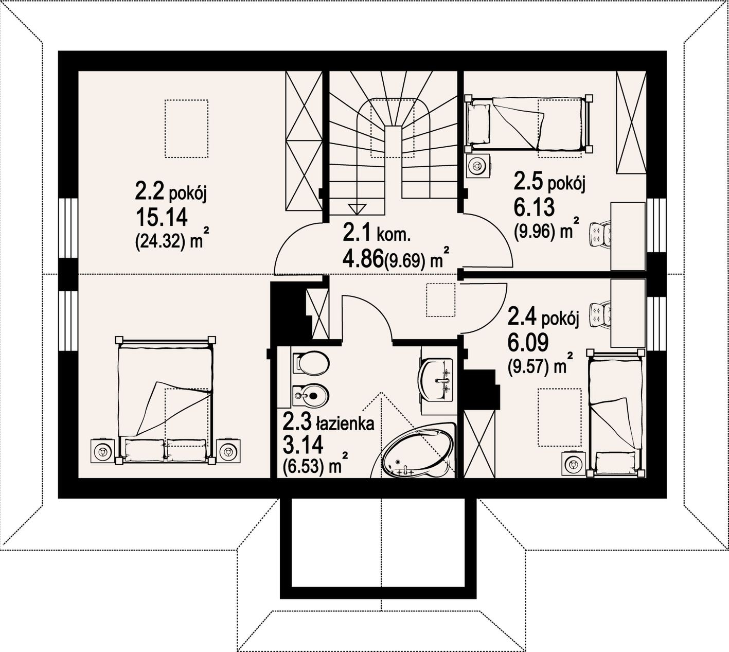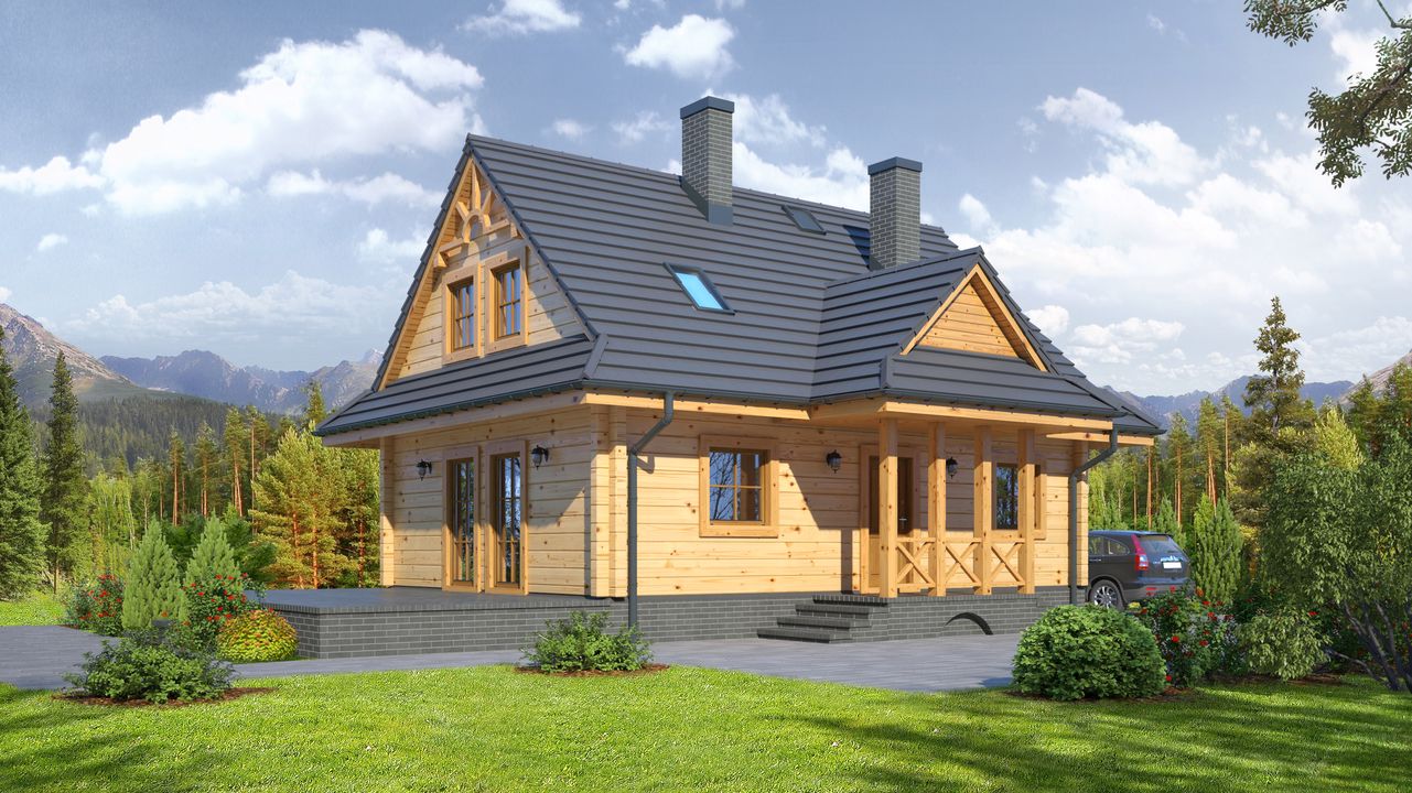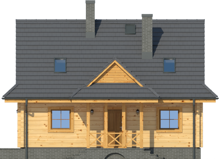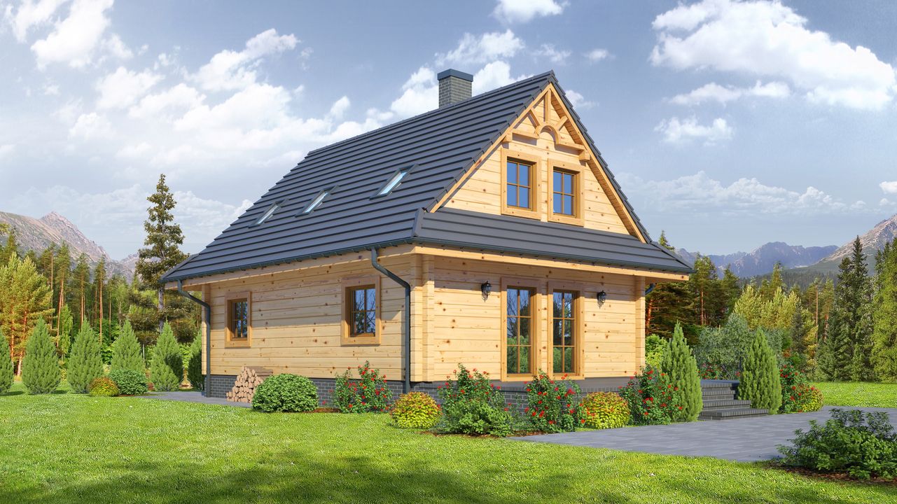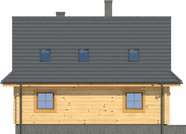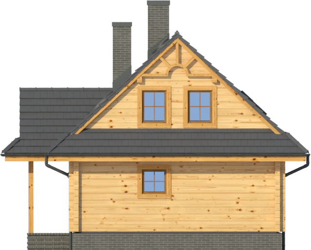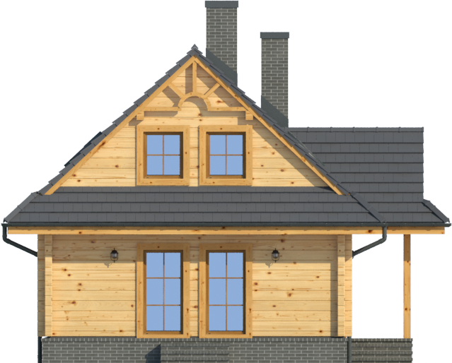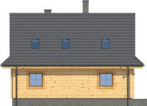 Wysokość ścianki kolankowej: 0.54 m. Strop: drewniany. Pokrycie dachu: dachówka ceramiczna. Ściany zewnętrzne: płazy drewniane + wełna mineralna + deska. Ściany wewnętrzne: płazy drewniane. Typ ogrzewania: kocioł gazowy lub kocioł na paliwo stałe. Inne: okna połaciowe Fakro.