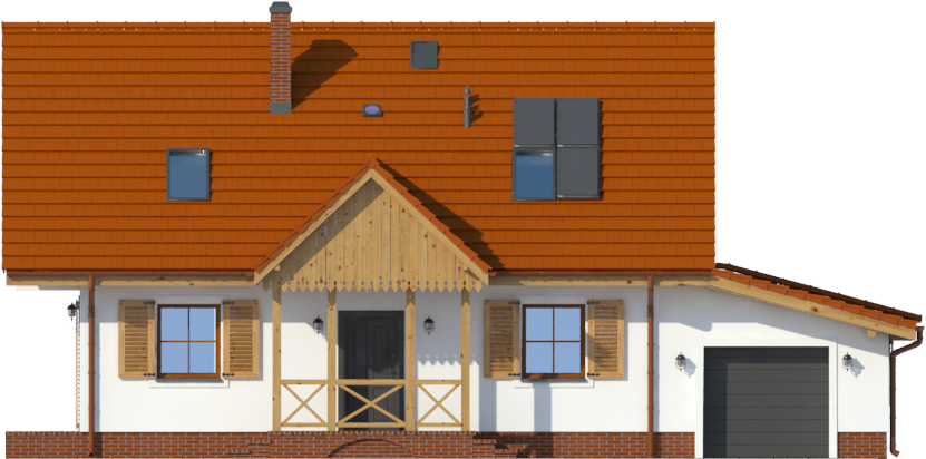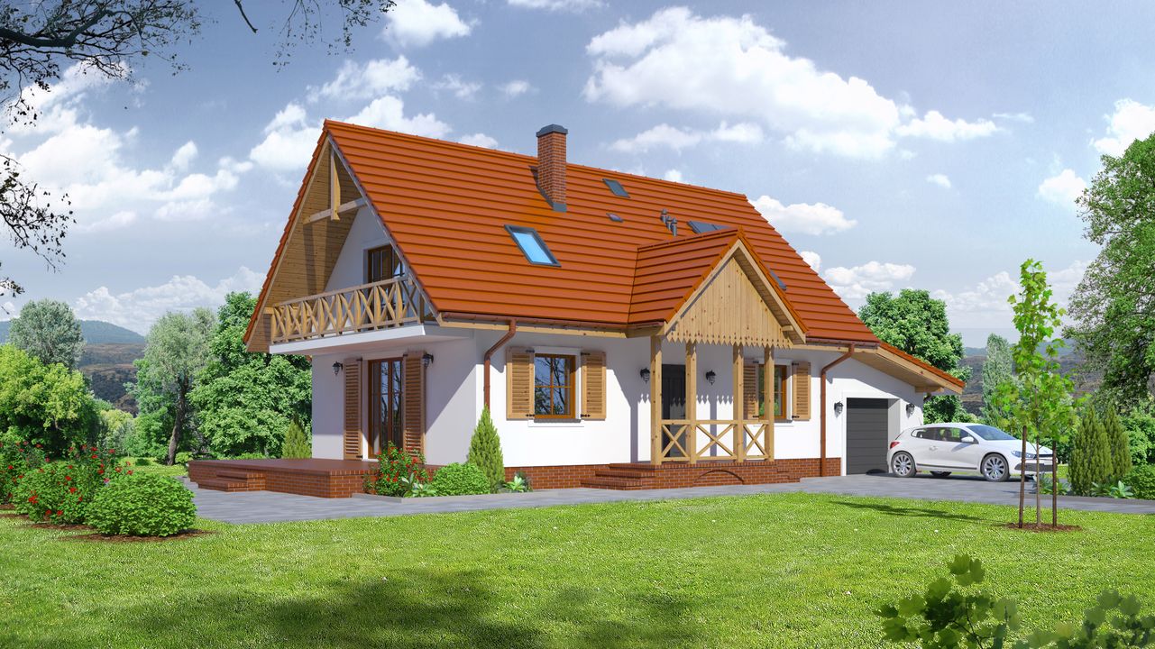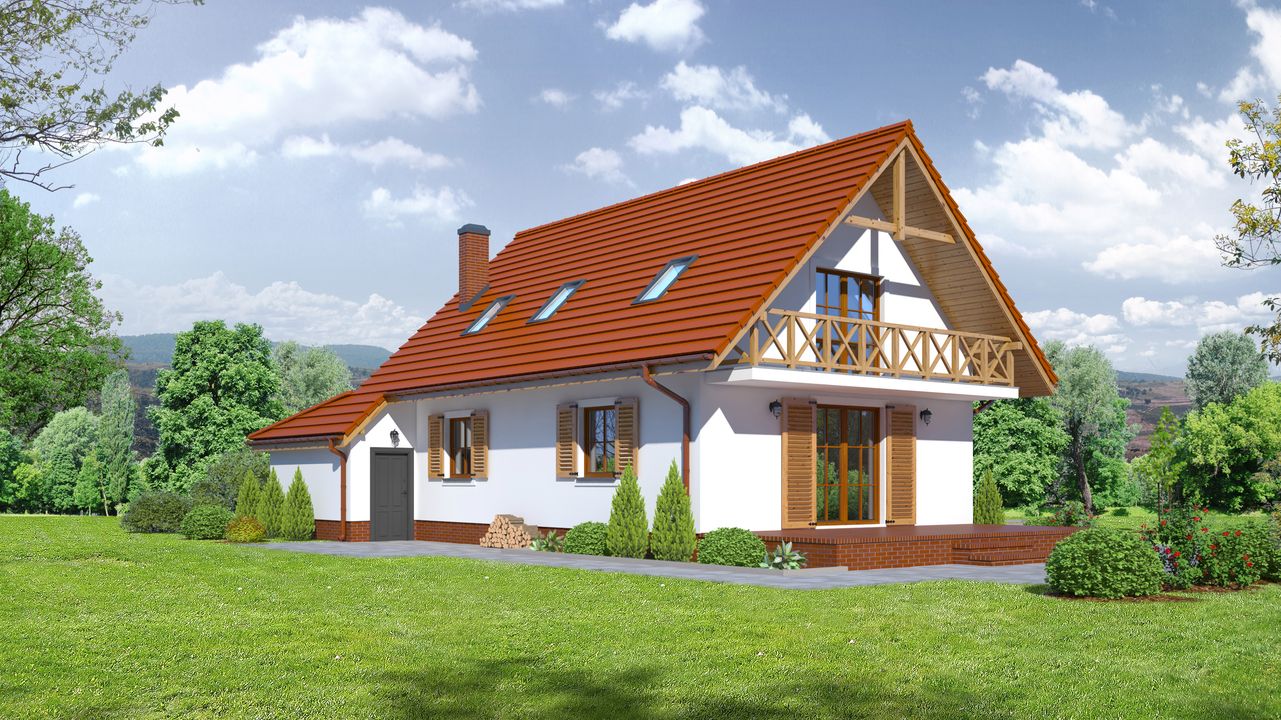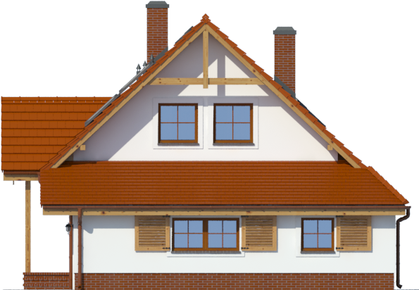 Graficzne opracowanie rzutów poglądowych widocznych na karcie projektu zostało wykonane przez Extradom.pl. Prezentowane przez Extradom.pl wizualizacje wykonane zostały przez autora projektu i należy poczytywać je jedynie za przykład i propozycję wykończenia, wizję architektoniczną autora projektu. Ostateczne wykończenie budynku może nastąpić na wiele sposobów. Szczegółowe rozwiązania zastosowane w oferowanej dokumentacji - w tym również ilość, lokalizacje i wygląd okien, drzwi, kominów - mogą w niewielkim stopniu różnić się od prezentowanej wizualizacji budynku.