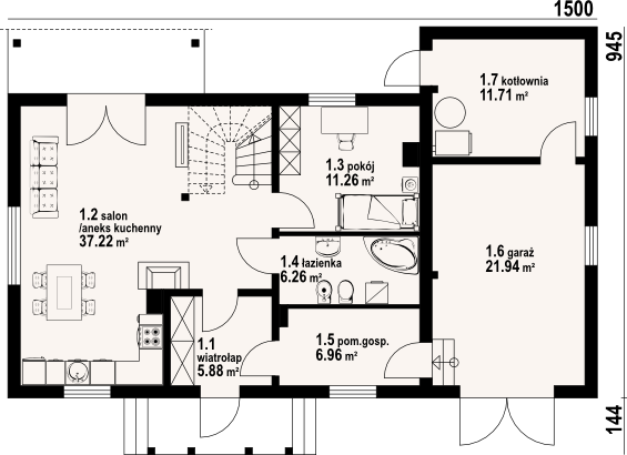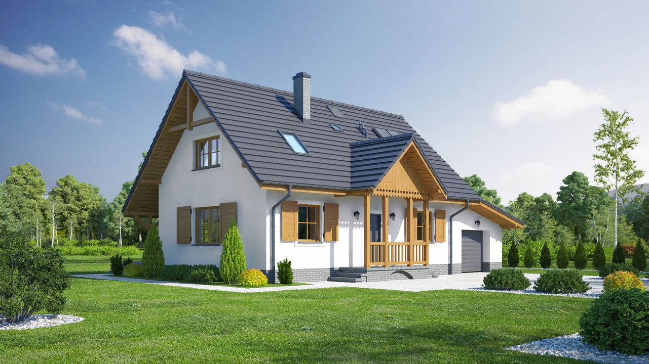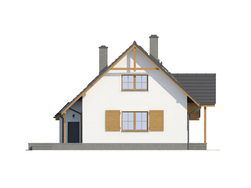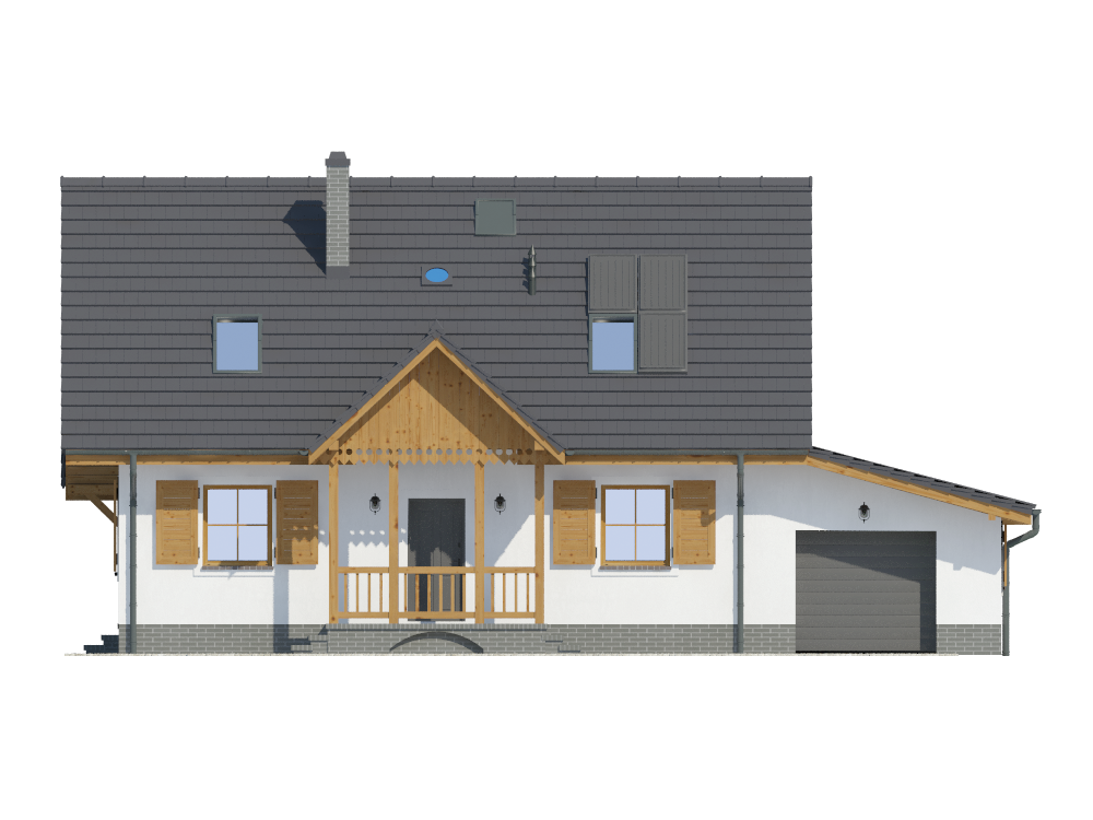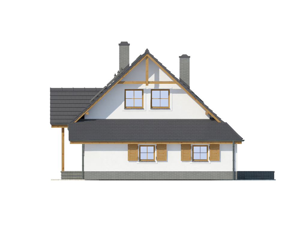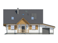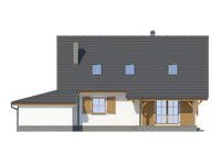 Graficzne opracowanie rzutów poglądowych widocznych na karcie projektu zostało wykonane przez Extradom.pl. Prezentowane przez Extradom.pl wizualizacje wykonane zostały przez autora projektu i należy poczytywać je jedynie za przykład i propozycję wykończenia, wizję architektoniczną autora projektu. Ostateczne wykończenie budynku może nastąpić na wiele sposobów. Szczegółowe rozwiązania zastosowane w oferowanej dokumentacji - w tym również ilość, lokalizacje i wygląd okien, drzwi, kominów - mogą w niewielkim stopniu różnić się od prezentowanej wizualizacji budynku.
