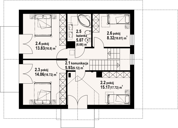 Wysokość ścianki kolankowej: 1.23 m. Strop: płyta żelbetowa. Pokrycie dachu: dachówka ceramiczna. Ściany zewnętrzne: bloczki z betonu komórkowego + styropian. Ściany wewnętrzne: bloczki z betonu komórkowego. Typ ogrzewania: kocioł na paliwo stałe. Inne: okna połaciowe Fakro.