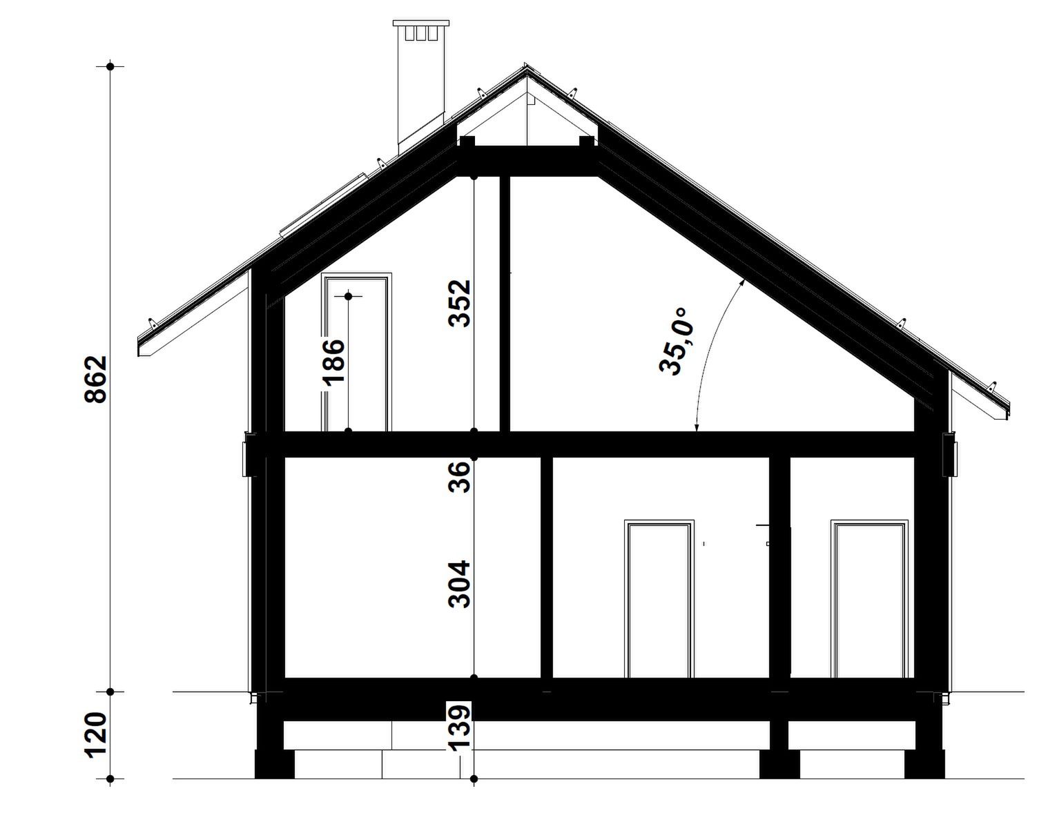 Ściany: bloczek z betonu komórkowego H+H 24 cm, wełna mineralna 20 cm, tynk lub szalunek drewniany. Strop: płyta żelbetowa. Ścianka kolankowa: 186 cm. Dach: dwuspadowy, nachylenie 35 st, więźba drewniana, blacha na rąbek stojący. Ogrzewanie podłogowe: zastosowano we wszystkich pomieszczeniach mieszkalnych. Wentylacja: grawitacyjna. Schody wewnętrzne: drewniane.