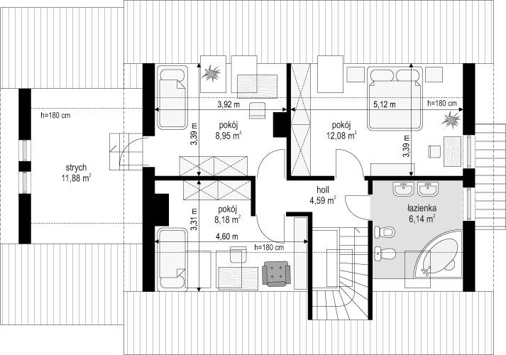 Fundamenty: betonowe wylewane. Ściany zewnętrzne: bloczki z betonu komórkowego + styropian. Strop: Teriva. Elewacje: tynk cienkopowłokowy. Pokrycie dachu: dachówka ceramiczna lub blachodachówka. Nachylenie dachu: 38 stopni.