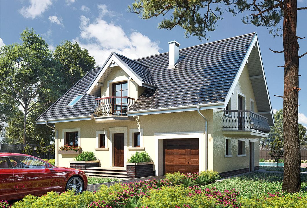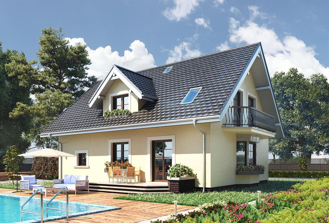 Graficzne opracowanie rzutów poglądowych widocznych na karcie projektu zostało wykonane przez Extradom.pl. Prezentowane przez Extradom.pl wizualizacje wykonane zostały przez autora projektu i należy poczytywać je jedynie za przykład i propozycję wykończenia, wizję architektoniczną autora projektu. Ostateczne wykończenie budynku może nastąpić na wiele sposobów. Szczegółowe rozwiązania zastosowane w oferowanej dokumentacji - w tym również ilość, lokalizacje i wygląd okien, drzwi, kominów - mogą w niewielkim stopniu różnić się od prezentowanej wizualizacji budynku.