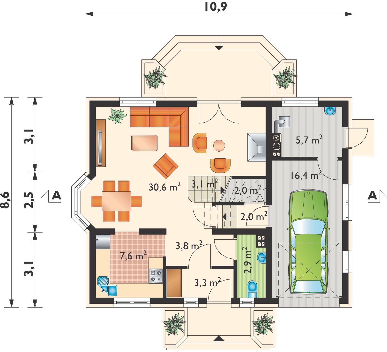 Technologia i konstrukcja: murowana – beton komórkowy. Ściany zewnętrzne: bloczki SOLBET Optimal gr. 24cm + docieplenie płyty FASROCK MAX gr. 15cm. Ściany wewnętrzne: bloczki SOLBET Optimal gr. 24cm, działowe gr. 12cm. Strop: żelbetowy. Konstrukcja dachu: drewniana, jętkowa. Rodzaj schodów: żelbetowe. Typ ogrzewania: kocioł na gaz. Aneks na paliwo stałe: dostępny (zapytaj o cenę). Pokrycie dachu: dachówka cementowa BRAAS. Elewacja: tynki silikonowe, silikatowe oraz mineralne.