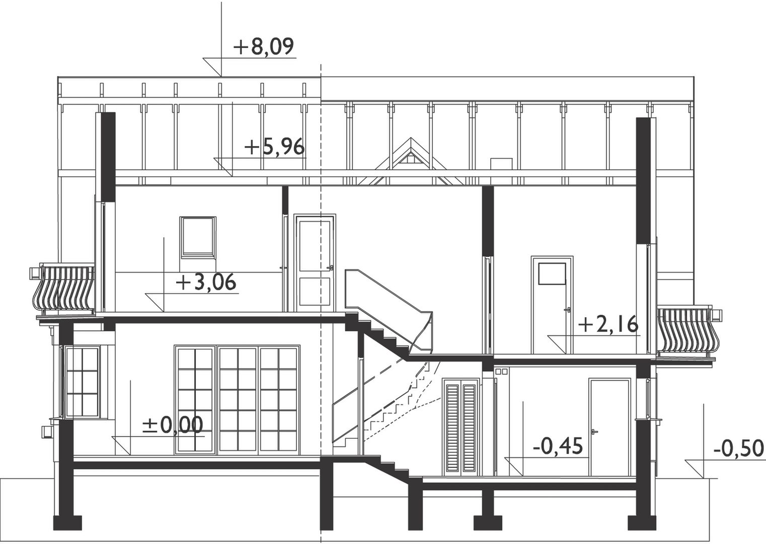 Wersja technologiczna: murowana - beton komórkowy. Strop: żelbetowy monolityczny. Typ schodów: płytowe żelbetowe. Konstrukcja dachu: drewniana krokwiowo-jętkowa. Typ ogrzewania: Kocioł na gaz. Dostępna wersja z pompą ciepła: Tak. Ściany zewnętrzne: 30 cm beton komórkowy. Ściany wewnętrzne: 24 cm beton komórkowy. Ściany wewnętrzne działowe: 11 cm beton komórkowy.