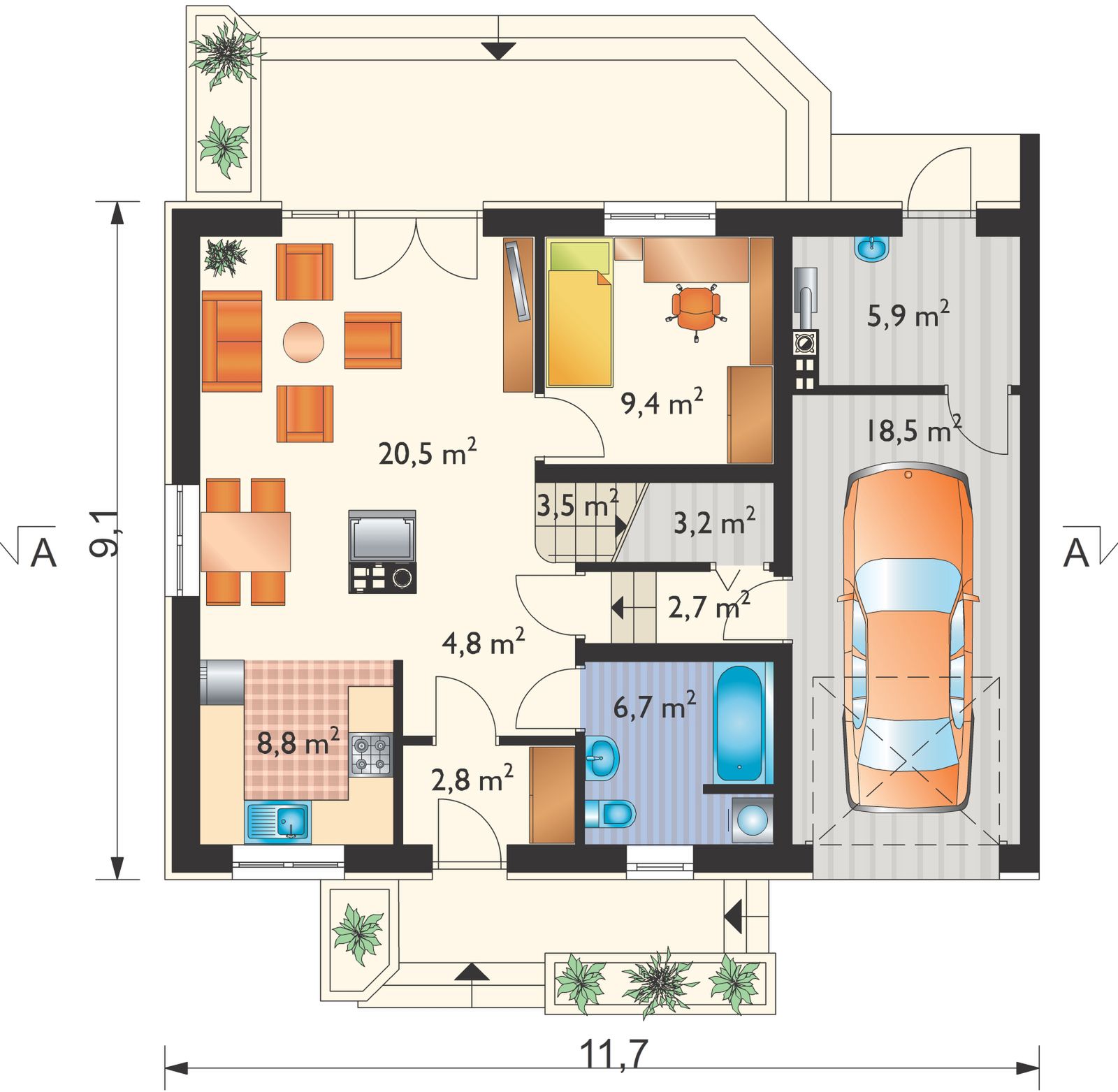 Technologia i konstrukcja: murowana – beton komórkowy. Ściany zewnętrzne: bloczki YTONG gr. 36,5cm + docieplenie płyty FASROCK MAX gr. 10cm. Ściany wewnętrzne: bloczki SILKA gr. 24cm i 12cm. Strop: żelbetowy, alternatywnie RECTOR. Konstrukcja dachu: drewniana, krokwiowa. Rodzaj schodów: żelbetowe. Typ ogrzewania: kocioł na gaz. Aneks na paliwo stałe: na zamówienie. Pokrycie dachu: dachówka cementowa BRAAS. Elewacja: tynk cienkowarstwowy polisilikatowy na siatce firmy BOLIX.