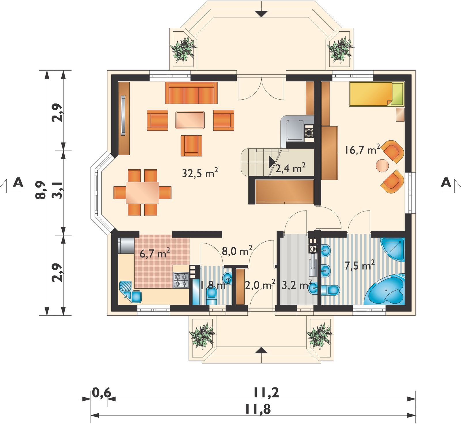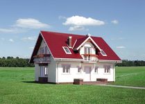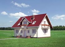 Graficzne opracowanie rzutów poglądowych widocznych na karcie projektu zostało wykonane przez Extradom.pl. Prezentowane przez Extradom.pl wizualizacje wykonane zostały przez autora projektu i należy poczytywać je jedynie za przykład i propozycję wykończenia, wizję architektoniczną autora projektu. Ostateczne wykończenie budynku może nastąpić na wiele sposobów. Szczegółowe rozwiązania zastosowane w oferowanej dokumentacji - w tym również ilość, lokalizacje i wygląd okien, drzwi, kominów - mogą w niewielkim stopniu różnić się od prezentowanej wizualizacji budynku.