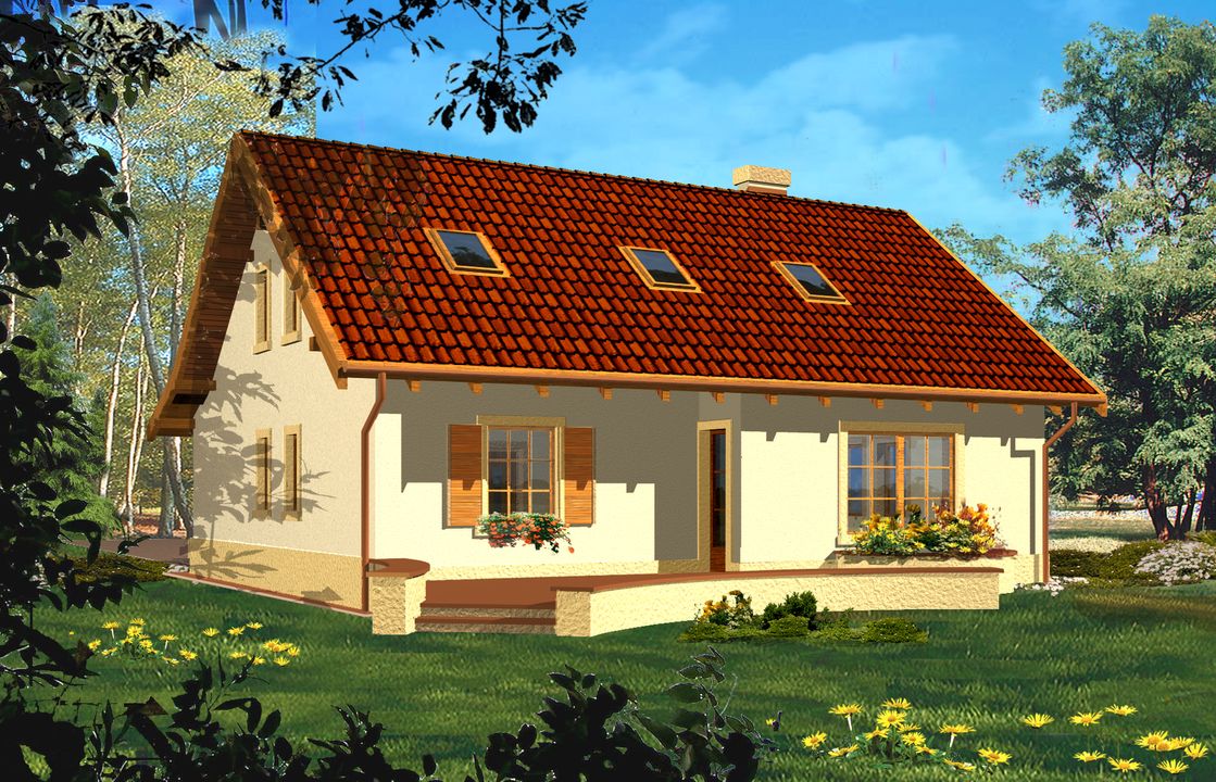 Konstrukcja ściany zewnętrzne - beton komórkowy gr. 24cm + styropian Termo Organika Termonium Plus gr. 12cm; ściany wewnętrzne - bloczek silikatowy gr. 24cm; ściany fundamentowe - bloczek betonowy; strop - Teriva; konstrukcja dachu - drewniana Instalacje W projekcie przewidziano instalacjie: c.o. i c.w.u., grzejniki płytowe, instalacje wodno-kanalizacyjna oraz elektryczne, wentylacja grawitacyjna. Wykończenie pokrycie dachowe - dachówka cementowa (w ramach adaptacji inny materiał); ścianki działowe na parterze-bloczek silikatowy, na poddaszu z płyt gipsowo-kartonowych; schody drewniane - dwubiegowe ze spocznikiem; okna - PVC, okna dachowe i wyłaz dachowy - Fakro.