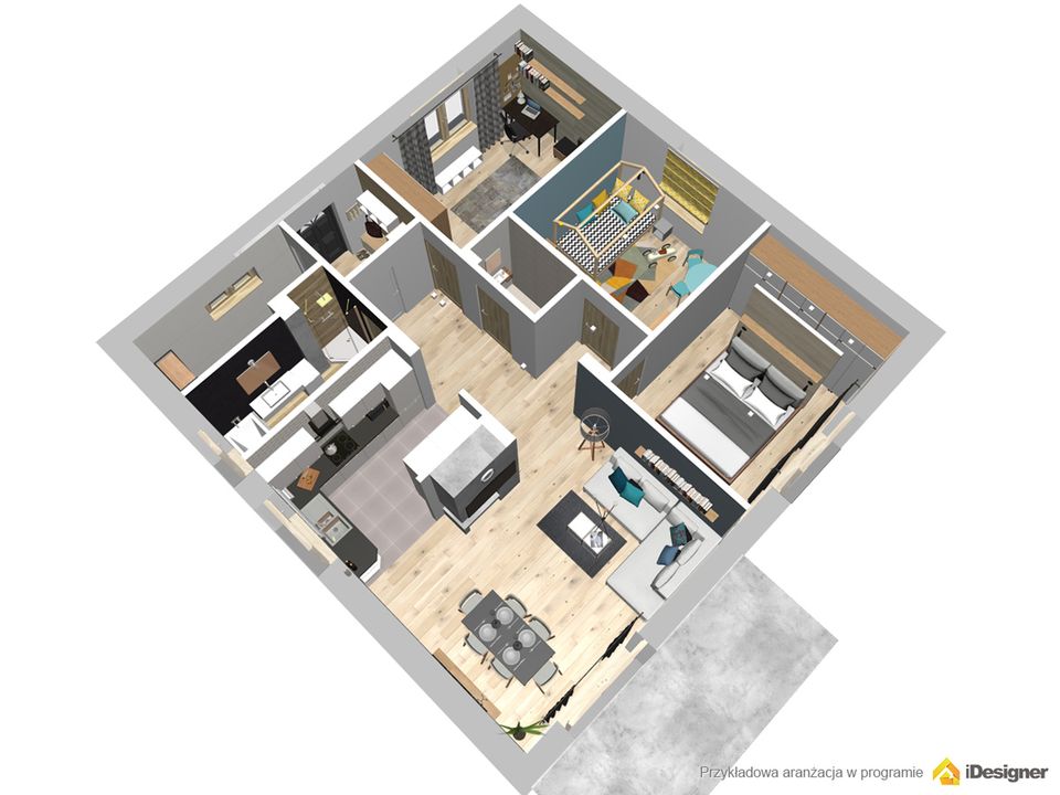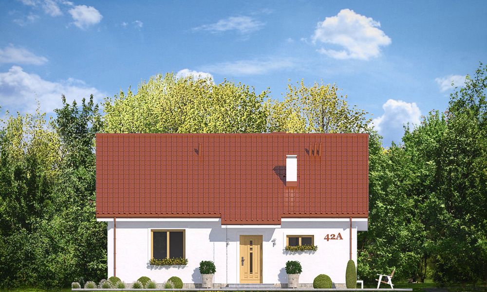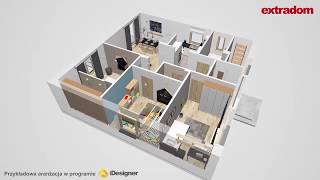 Graficzne opracowanie rzutów poglądowych widocznych na karcie projektu zostało wykonane przez Extradom.pl. Prezentowane przez Extradom.pl wizualizacje wykonane zostały przez autora projektu i należy poczytywać je jedynie za przykład i propozycję wykończenia, wizję architektoniczną autora projektu. Ostateczne wykończenie budynku może nastąpić na wiele sposobów. Szczegółowe rozwiązania zastosowane w oferowanej dokumentacji - w tym również ilość, lokalizacje i wygląd okien, drzwi, kominów - mogą w niewielkim stopniu różnić się od prezentowanej wizualizacji budynku.