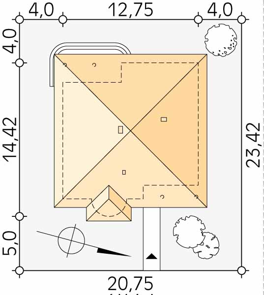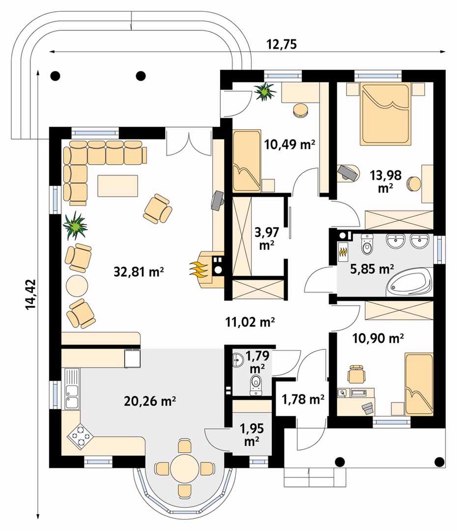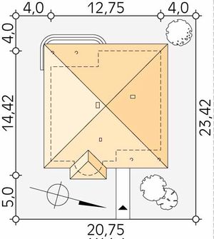 Graficzne opracowanie rzutów poglądowych widocznych na karcie projektu zostało wykonane przez Extradom.pl. Prezentowane przez Extradom.pl wizualizacje wykonane zostały przez autora projektu i należy poczytywać je jedynie za przykład i propozycję wykończenia, wizję architektoniczną autora projektu. Ostateczne wykończenie budynku może nastąpić na wiele sposobów. Szczegółowe rozwiązania zastosowane w oferowanej dokumentacji - w tym również ilość, lokalizacje i wygląd okien, drzwi, kominów - mogą w niewielkim stopniu różnić się od prezentowanej wizualizacji budynku.