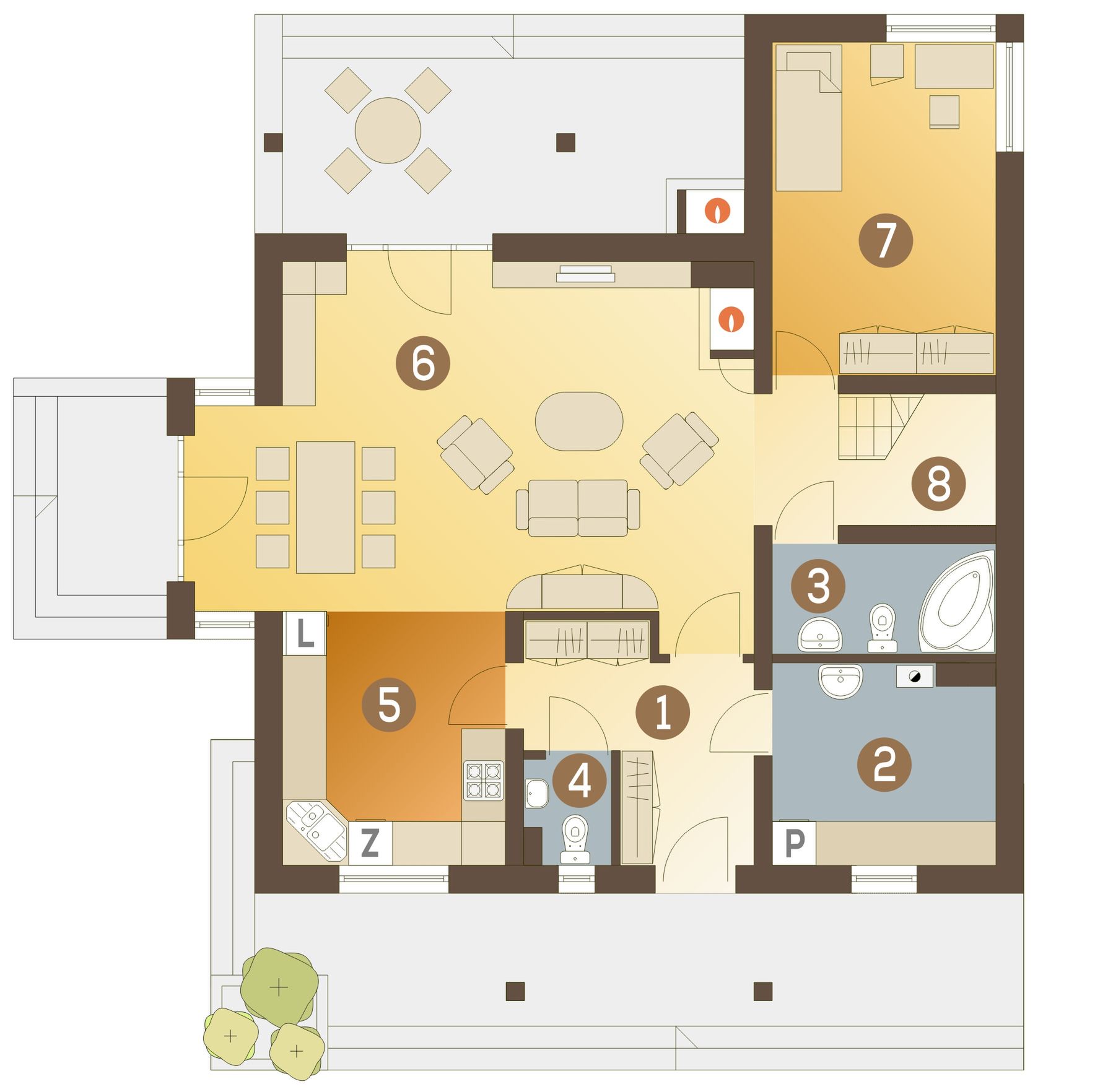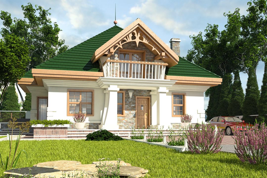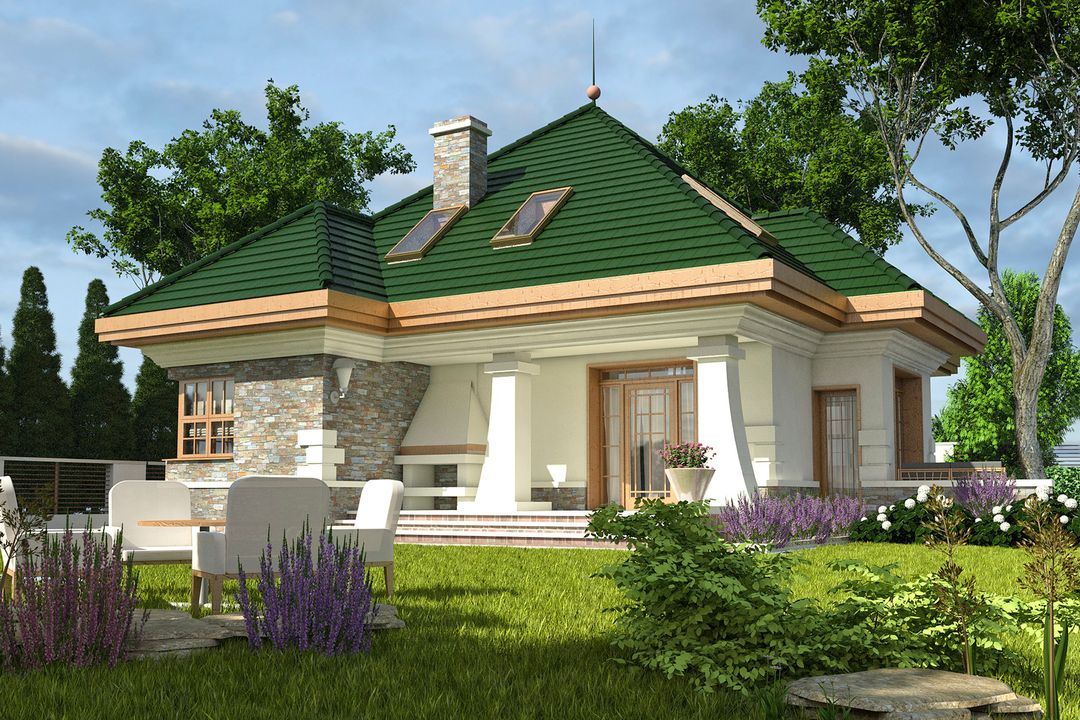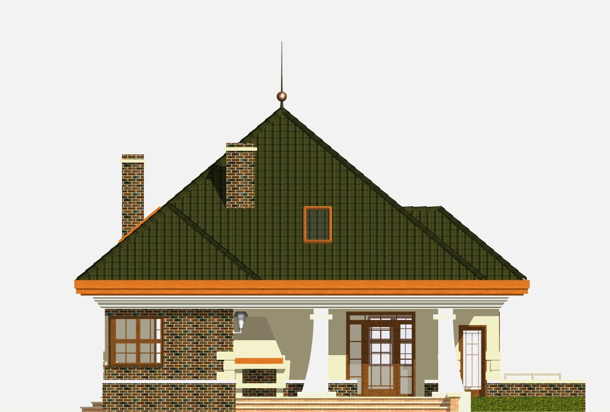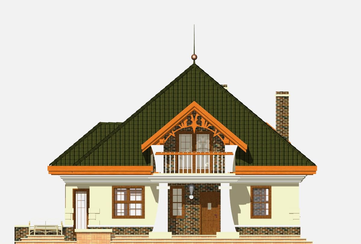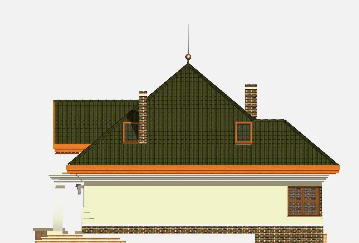 Graficzne opracowanie rzutów poglądowych widocznych na karcie projektu zostało wykonane przez Extradom.pl. Prezentowane przez Extradom.pl wizualizacje wykonane zostały przez autora projektu i należy poczytywać je jedynie za przykład i propozycję wykończenia, wizję architektoniczną autora projektu. Ostateczne wykończenie budynku może nastąpić na wiele sposobów. Szczegółowe rozwiązania zastosowane w oferowanej dokumentacji - w tym również ilość, lokalizacje i wygląd okien, drzwi, kominów - mogą w niewielkim stopniu różnić się od prezentowanej wizualizacji budynku.